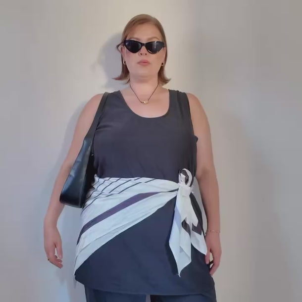 The geometric print adds a modern edge, while the generous square shape allows for endless styling options — wear it as a top, tie it around the neck, or drape it over the shoulders for a sophisticated layer.