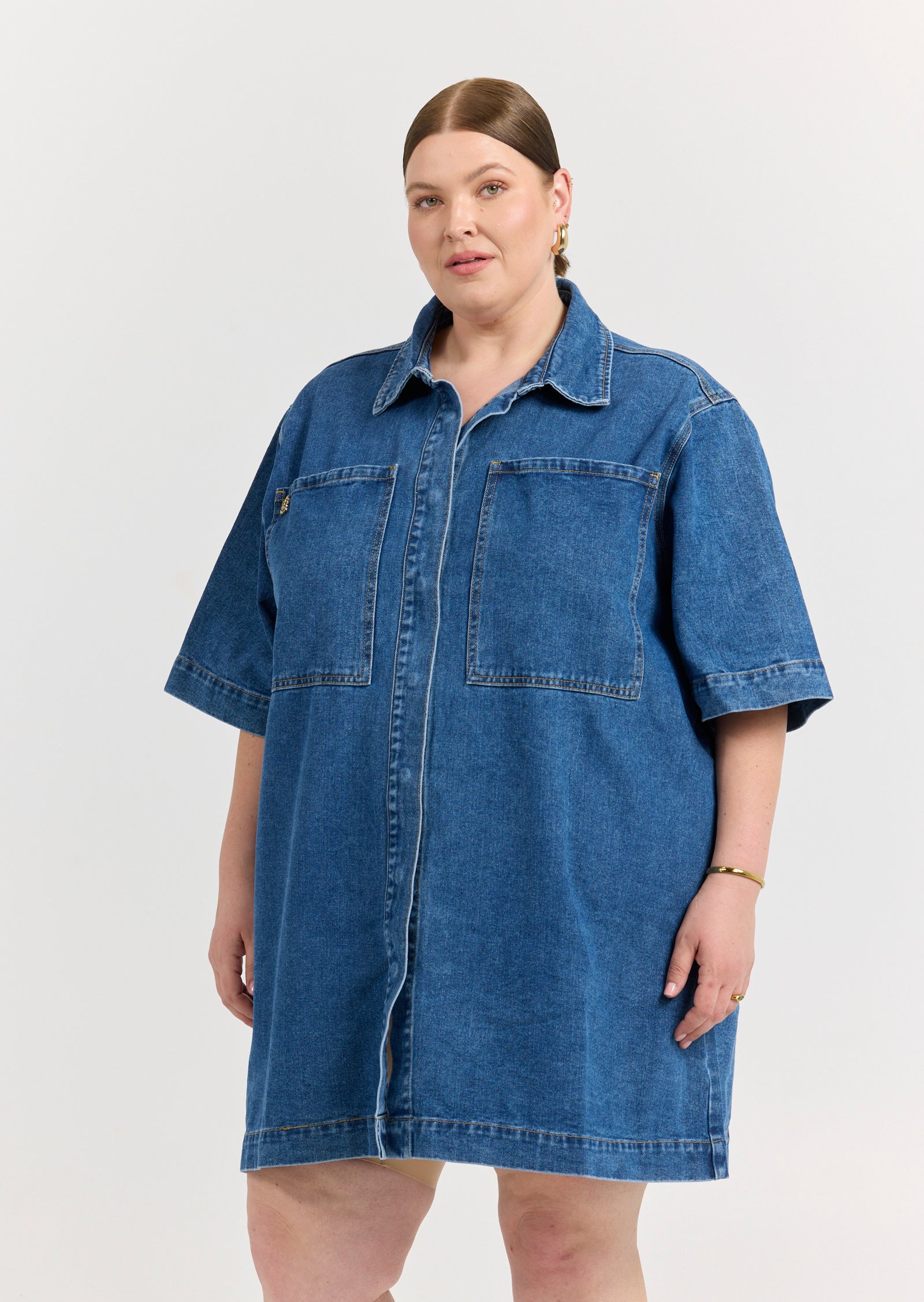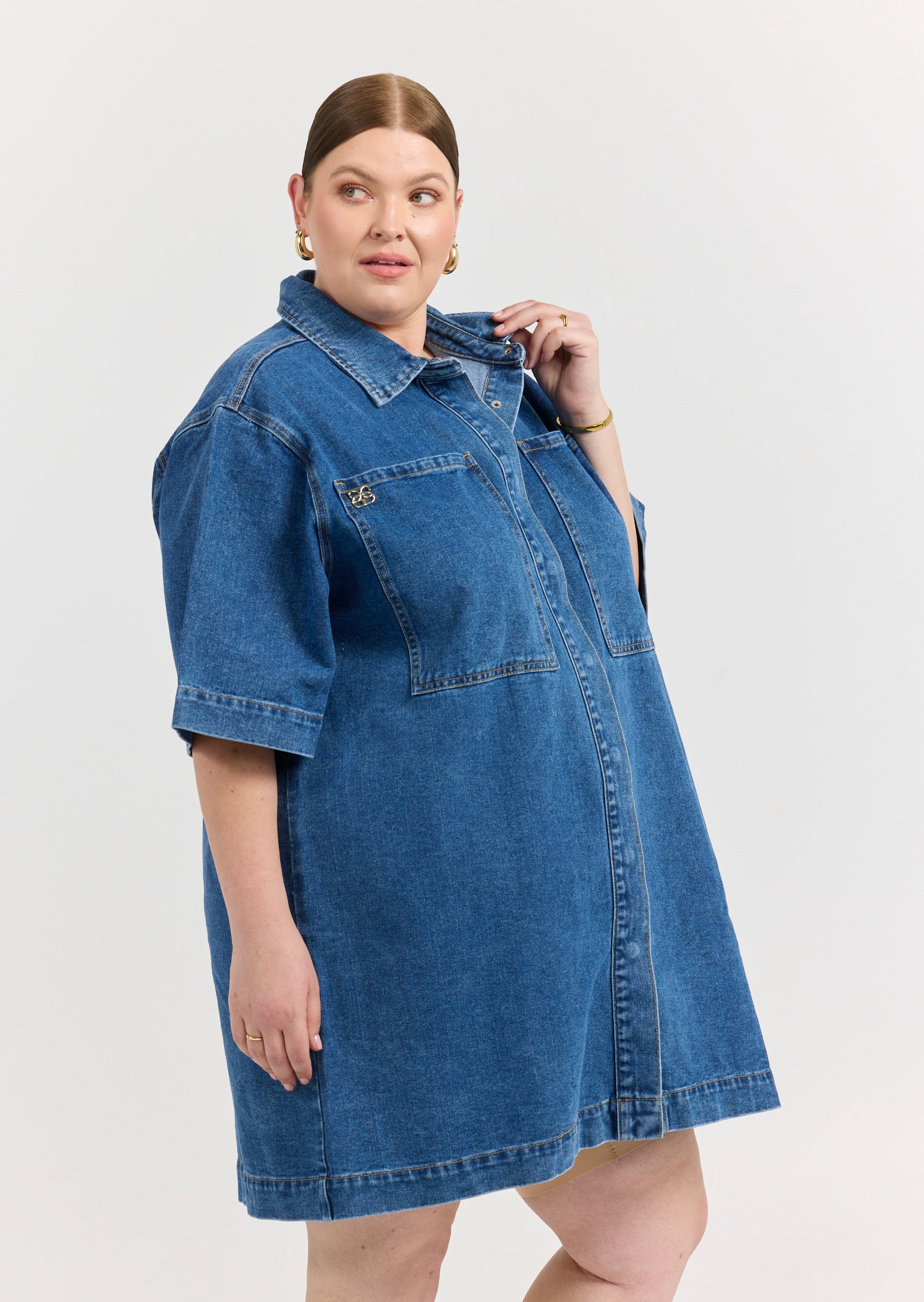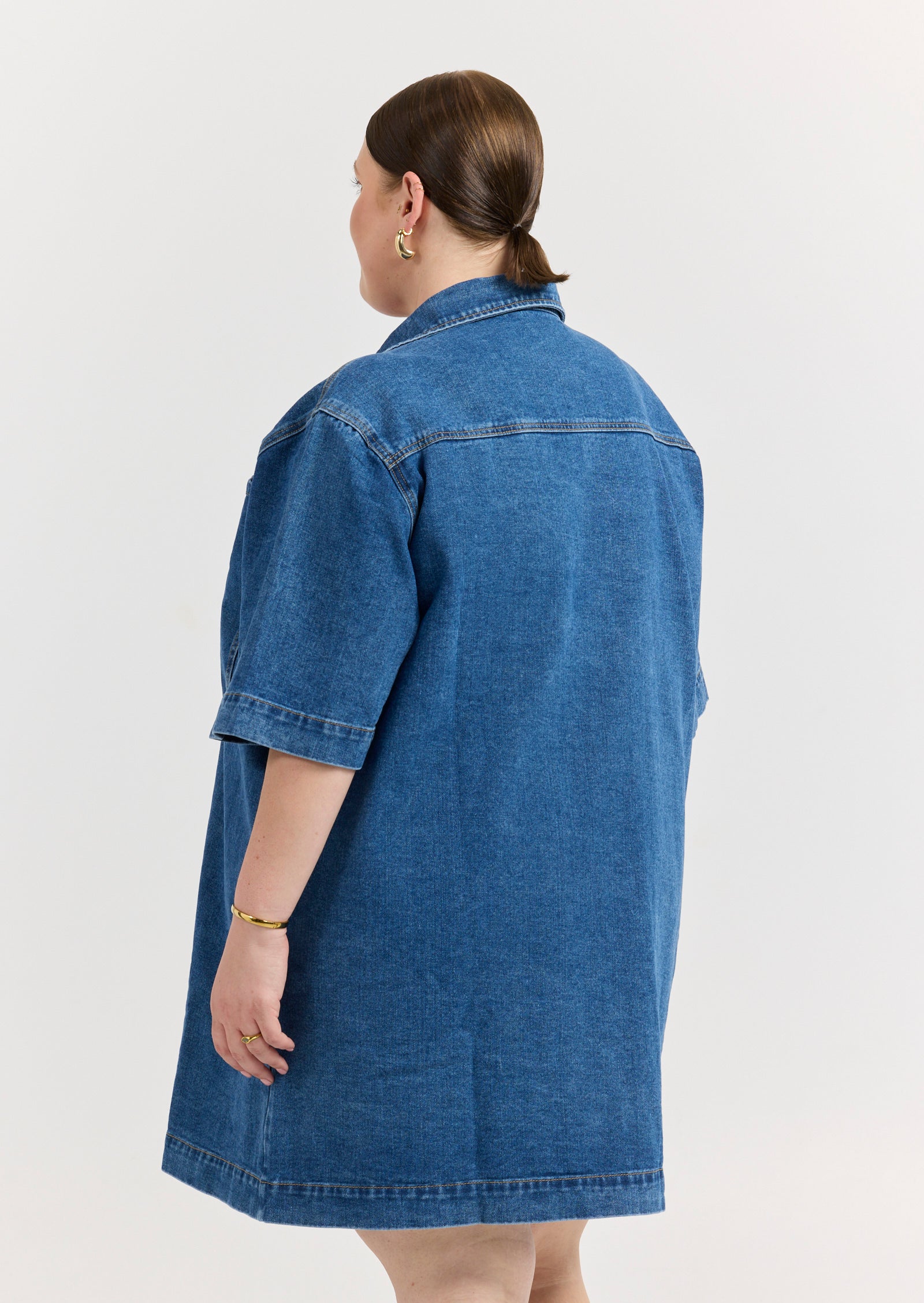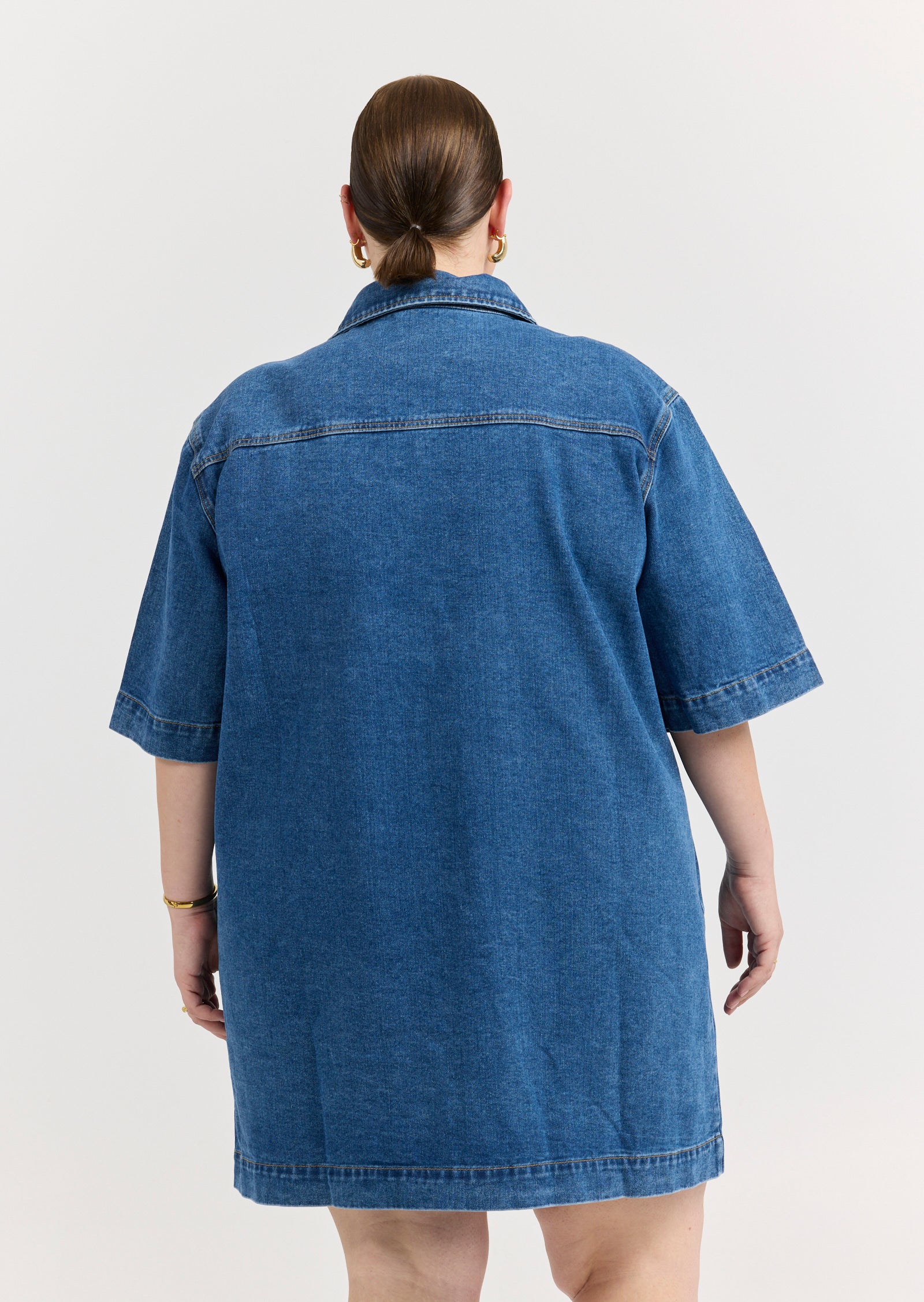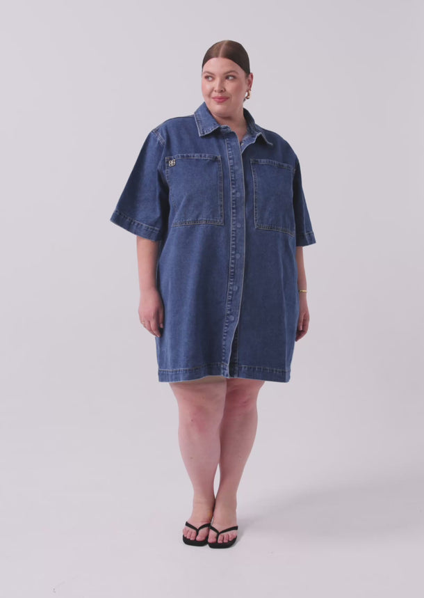 Meet the Gabriel Denim Mini Dress - a structured one-piece wonder designed for sizes 14-24. This dress reimagines denim in a tailored, size inclusive silhouette with strong lines and feminine edge.