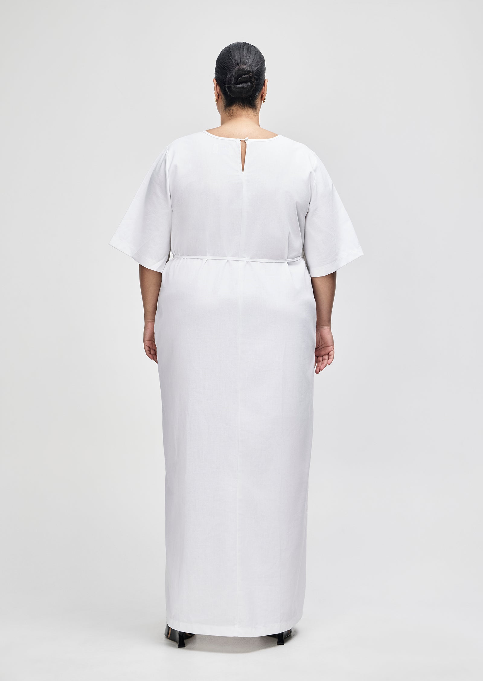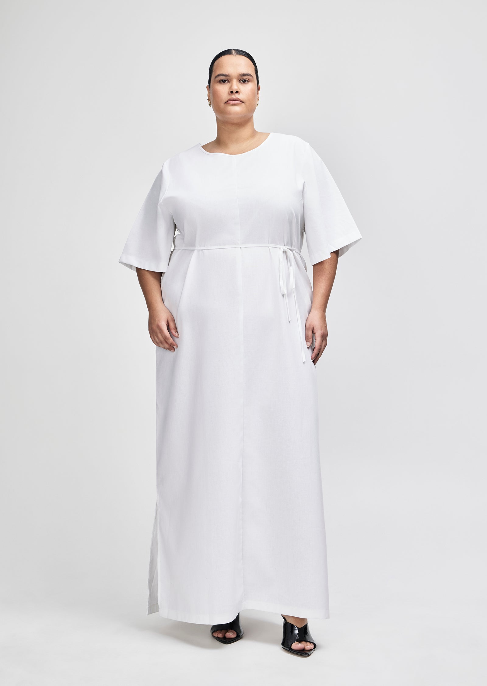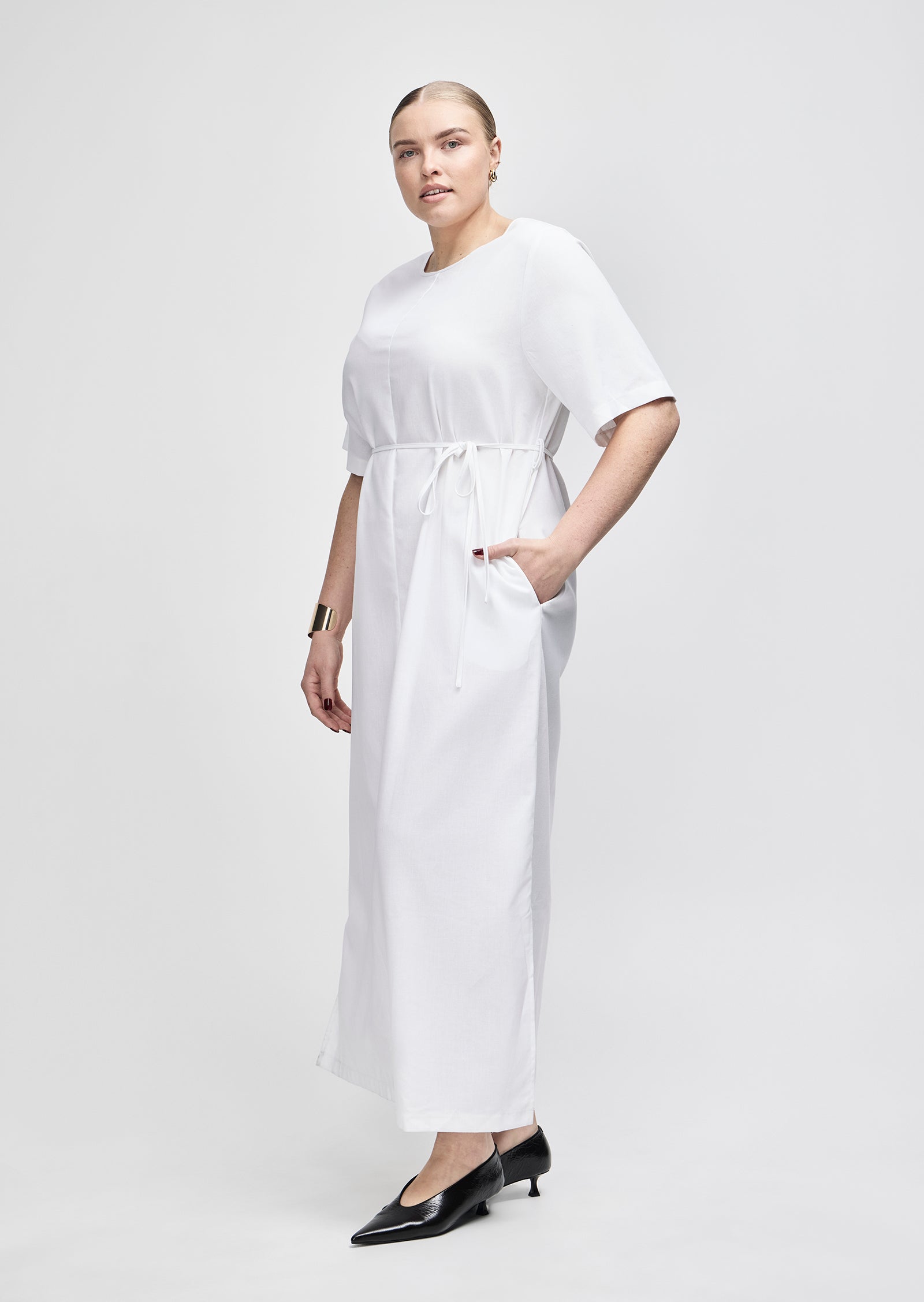 Lucienne features a rounded crew neckline, relaxed short sleeves, and a streamlined full-length silhouette. The subtle waist shaping adds gentle definition without compromising comfort, while the lightweight fabric keeps the look effortlessly refined.