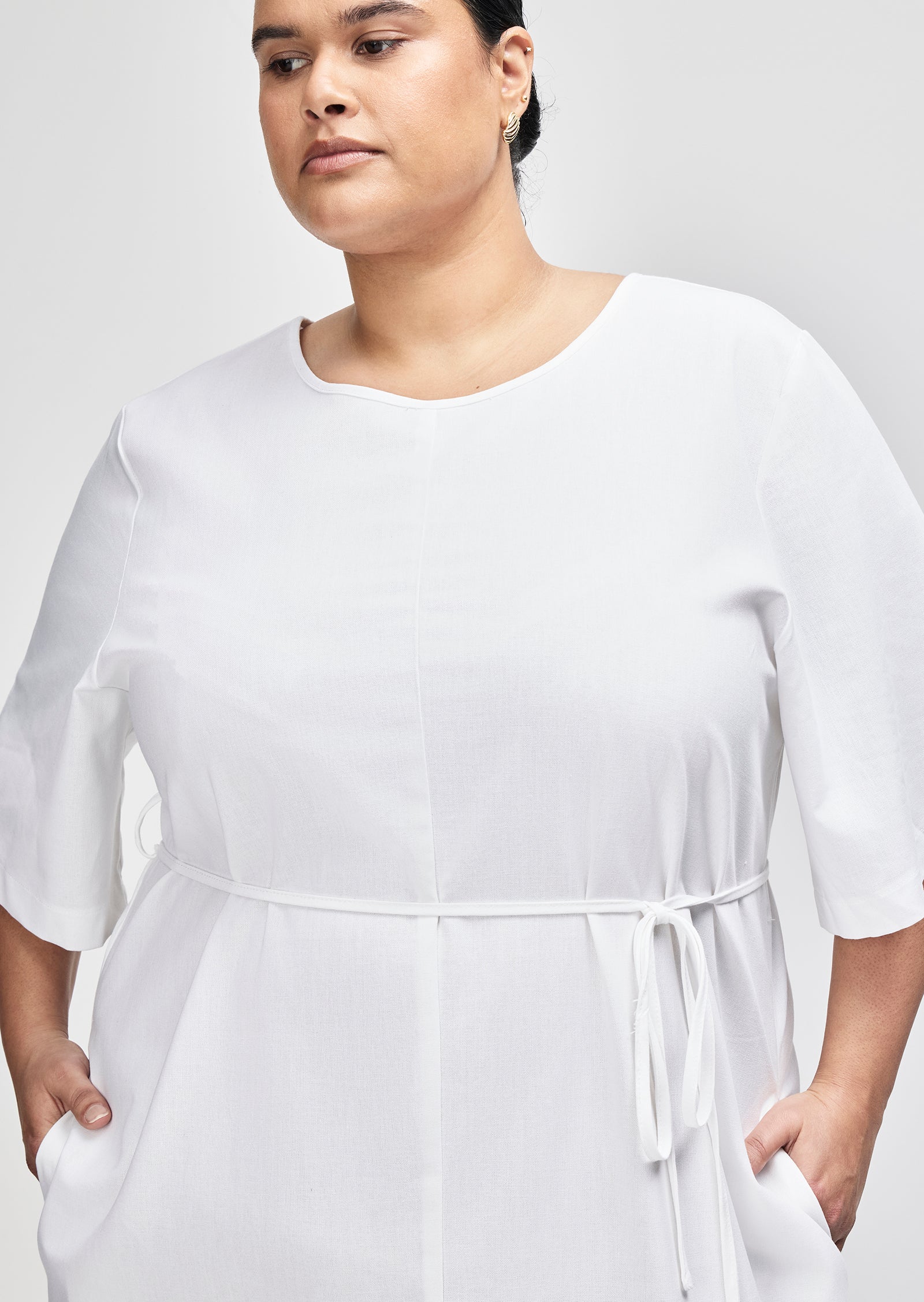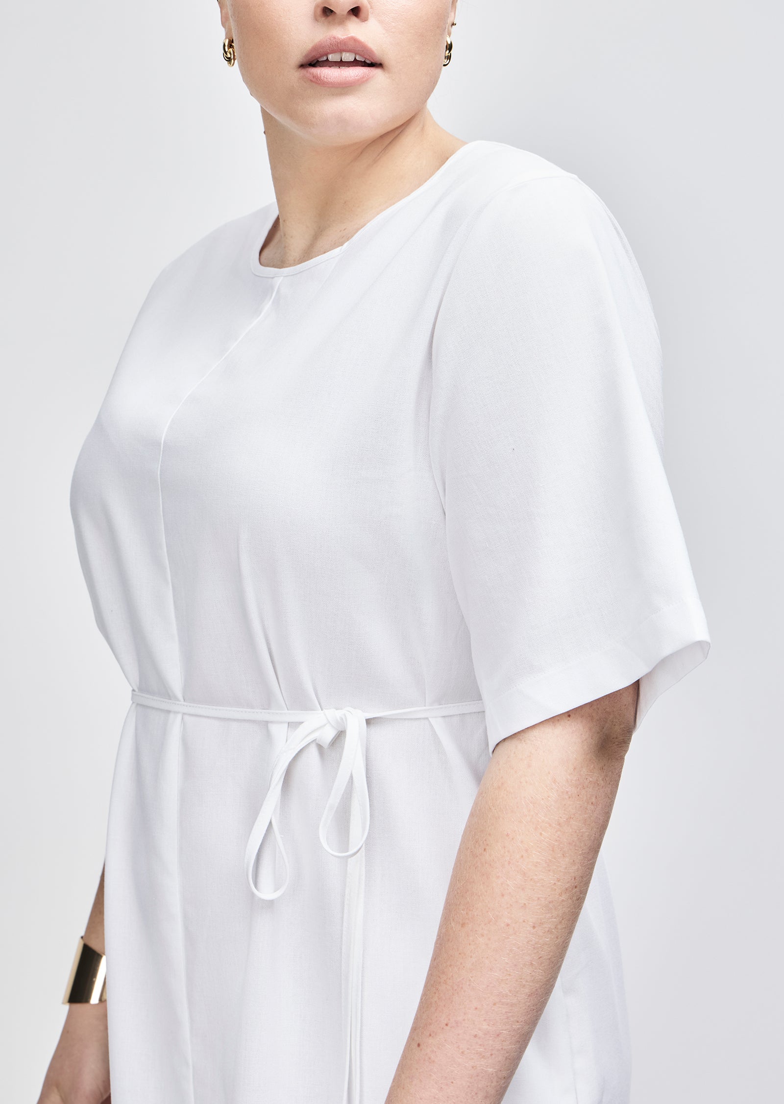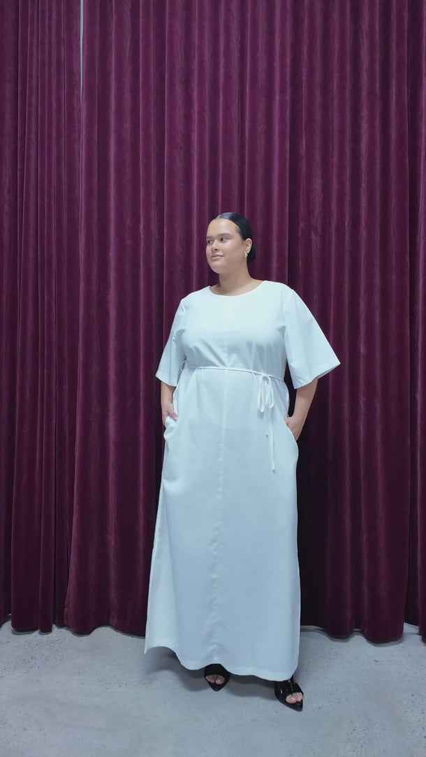 Lucienne features a rounded crew neckline, relaxed short sleeves, and a streamlined full-length silhouette. The subtle waist shaping adds gentle definition without compromising comfort, while the lightweight fabric keeps the look effortlessly refined.