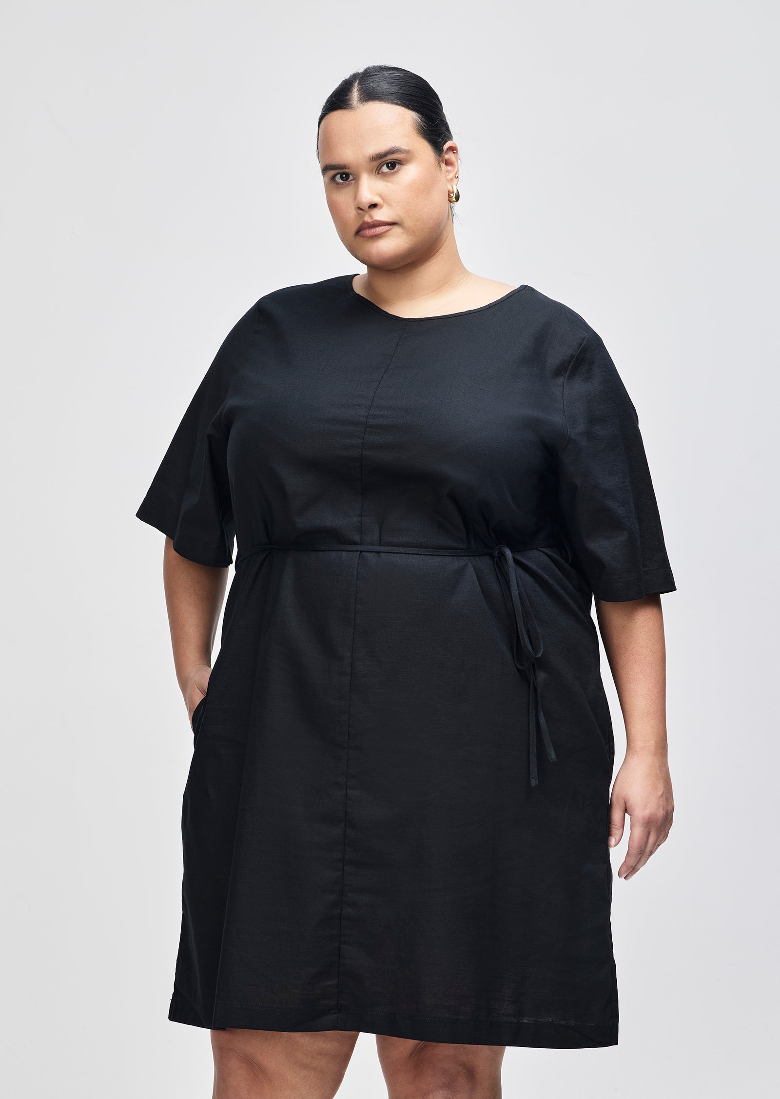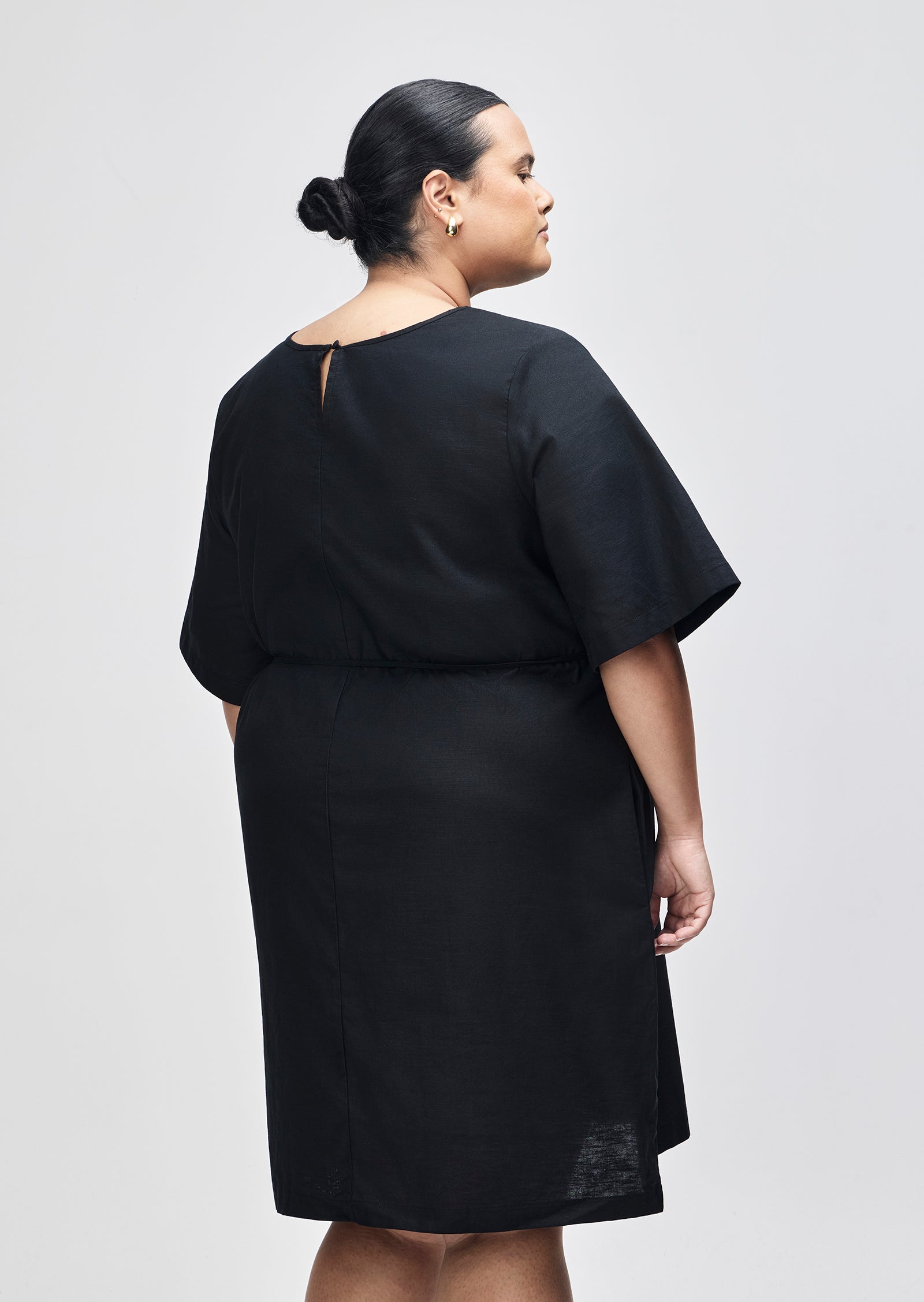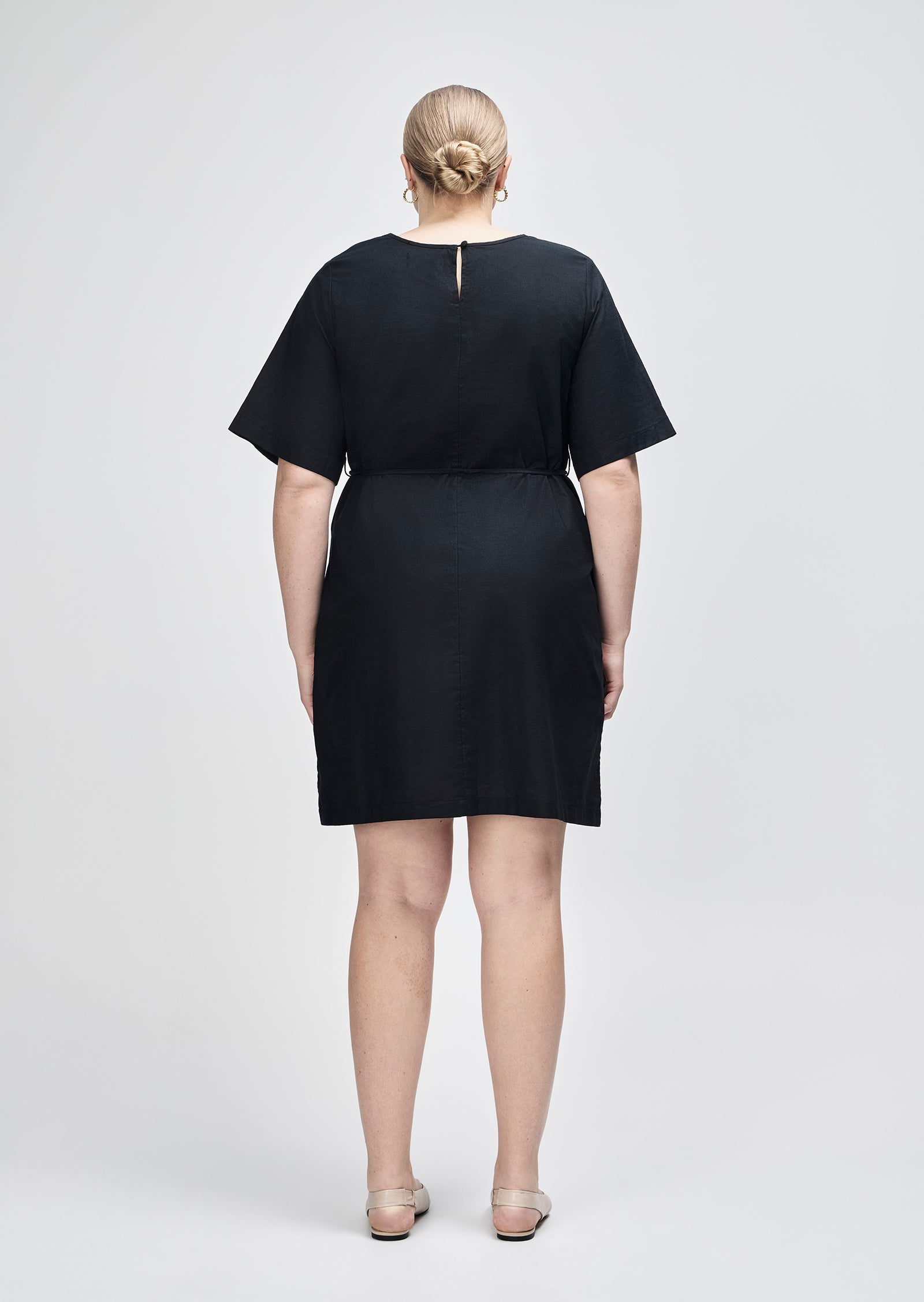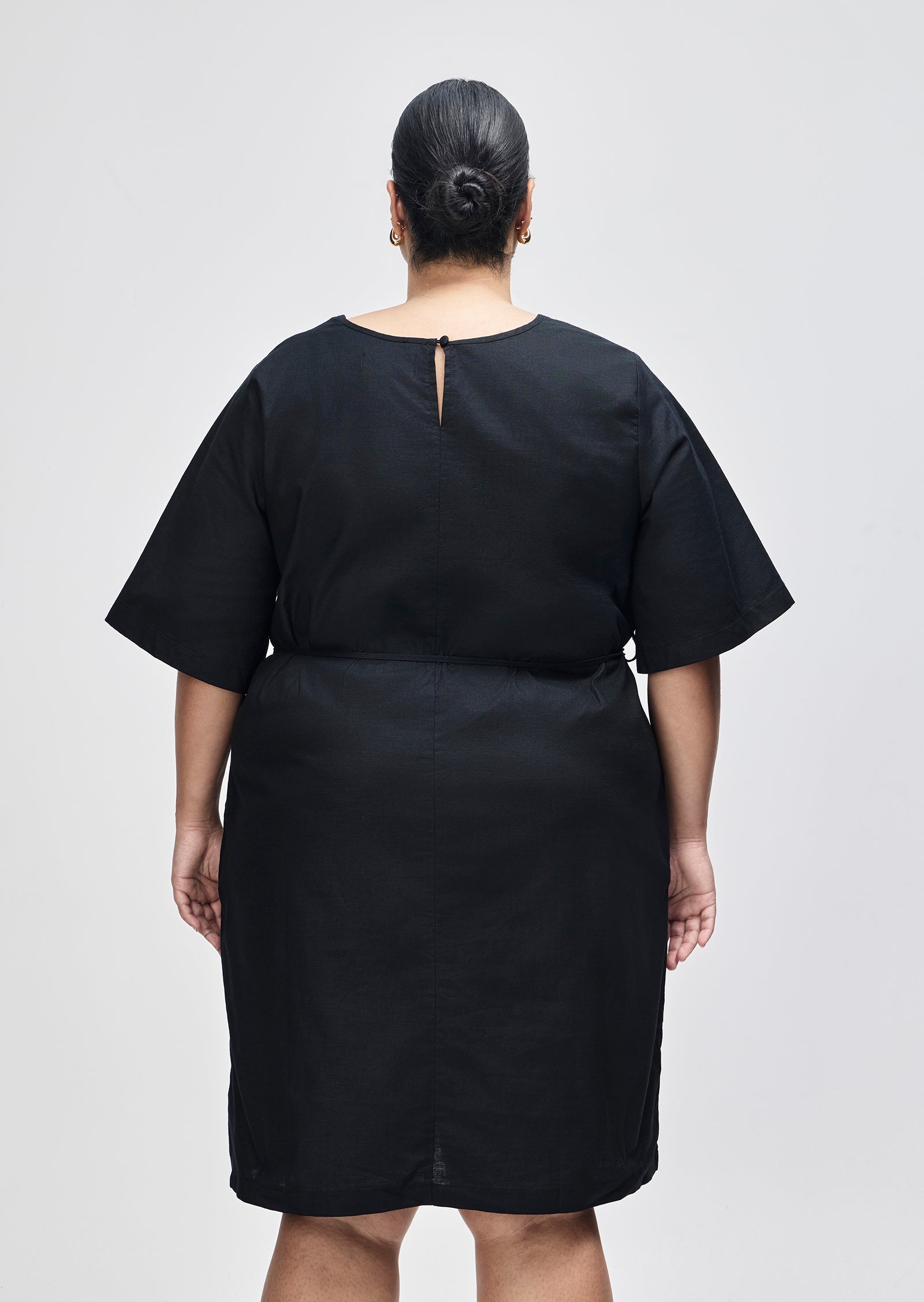 Lucienne includes a centre back neck keyhole, side pockets, and a removable waist tie for flexible styling. The unlined construction keeps it lightweight and breathable.