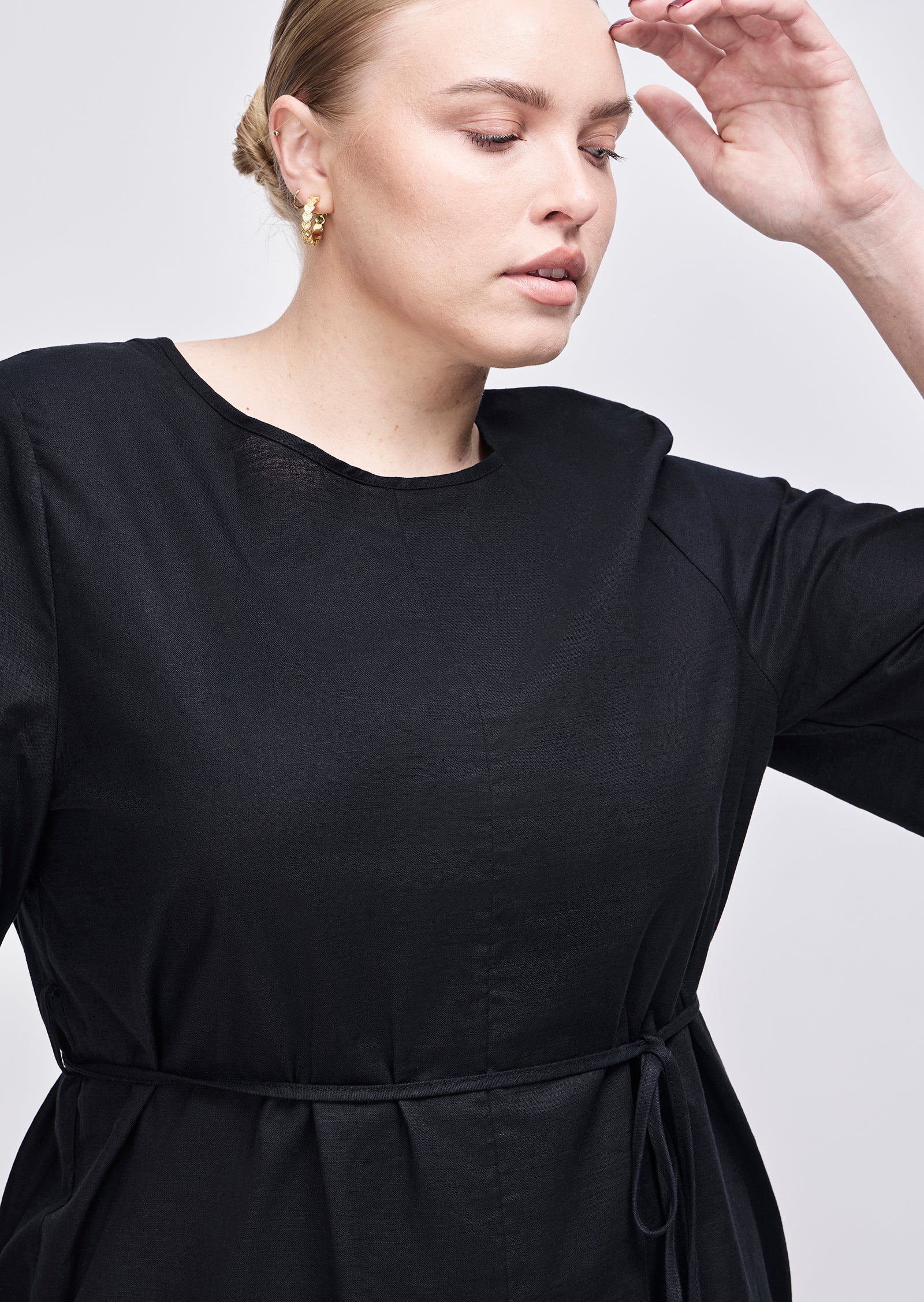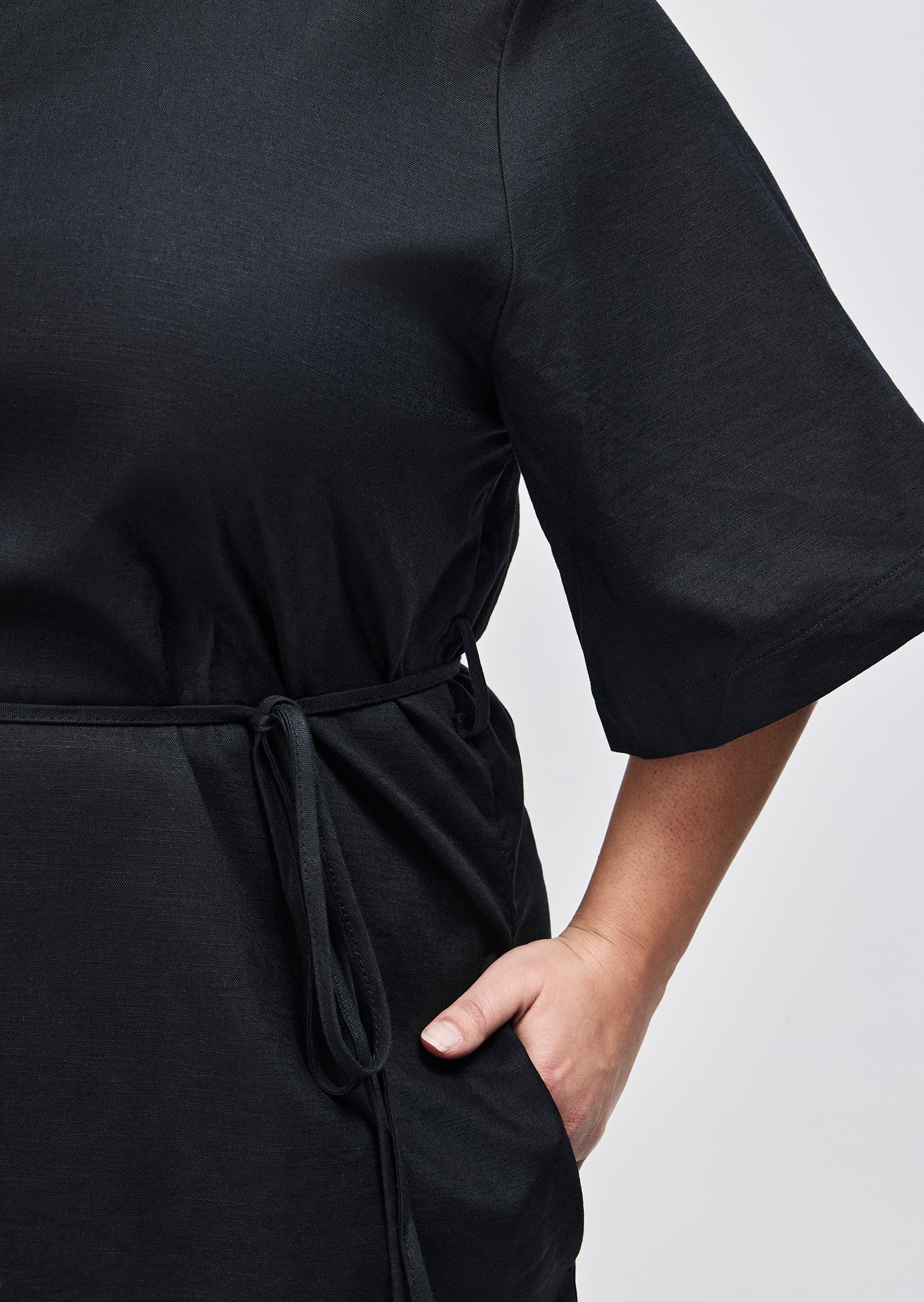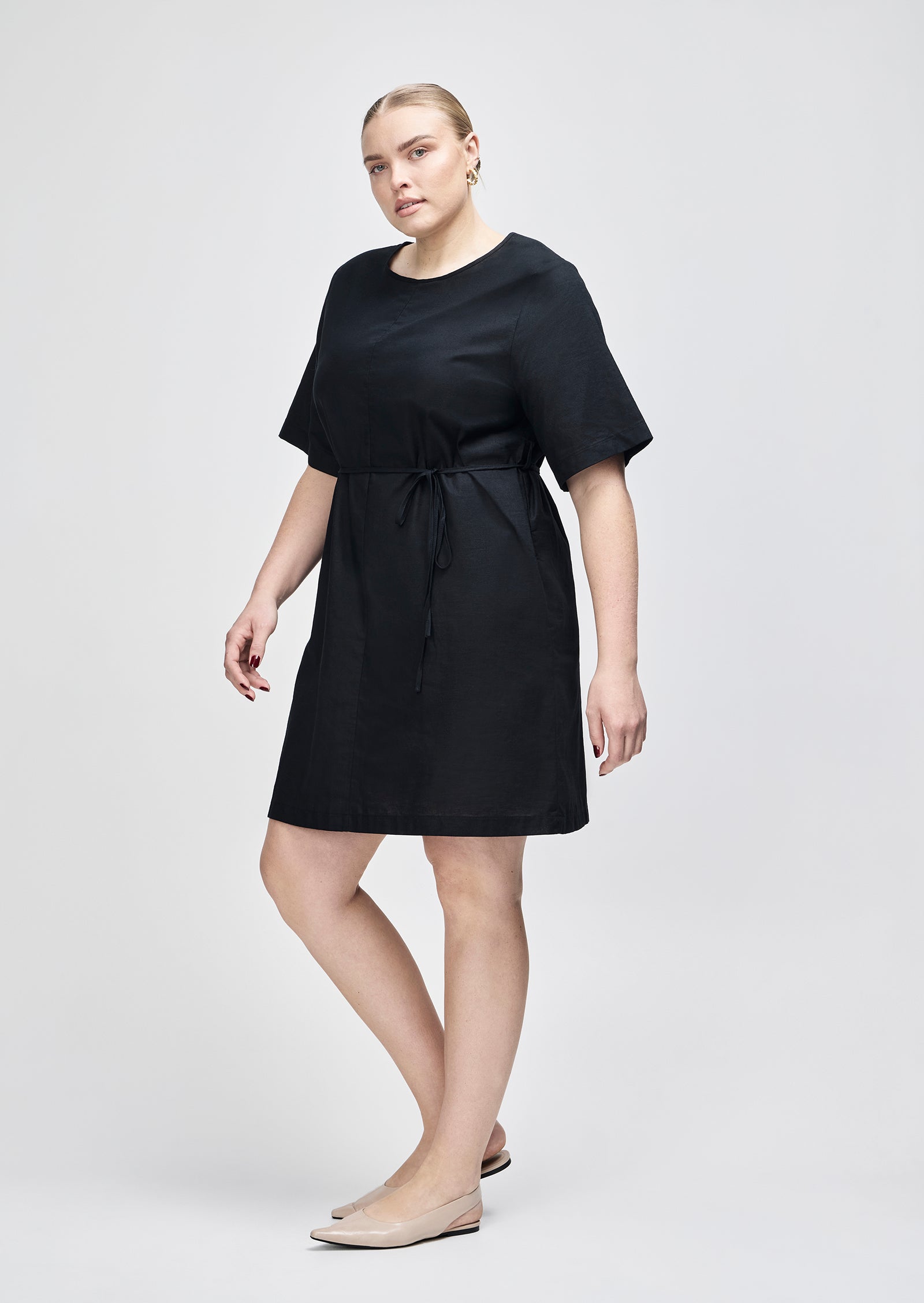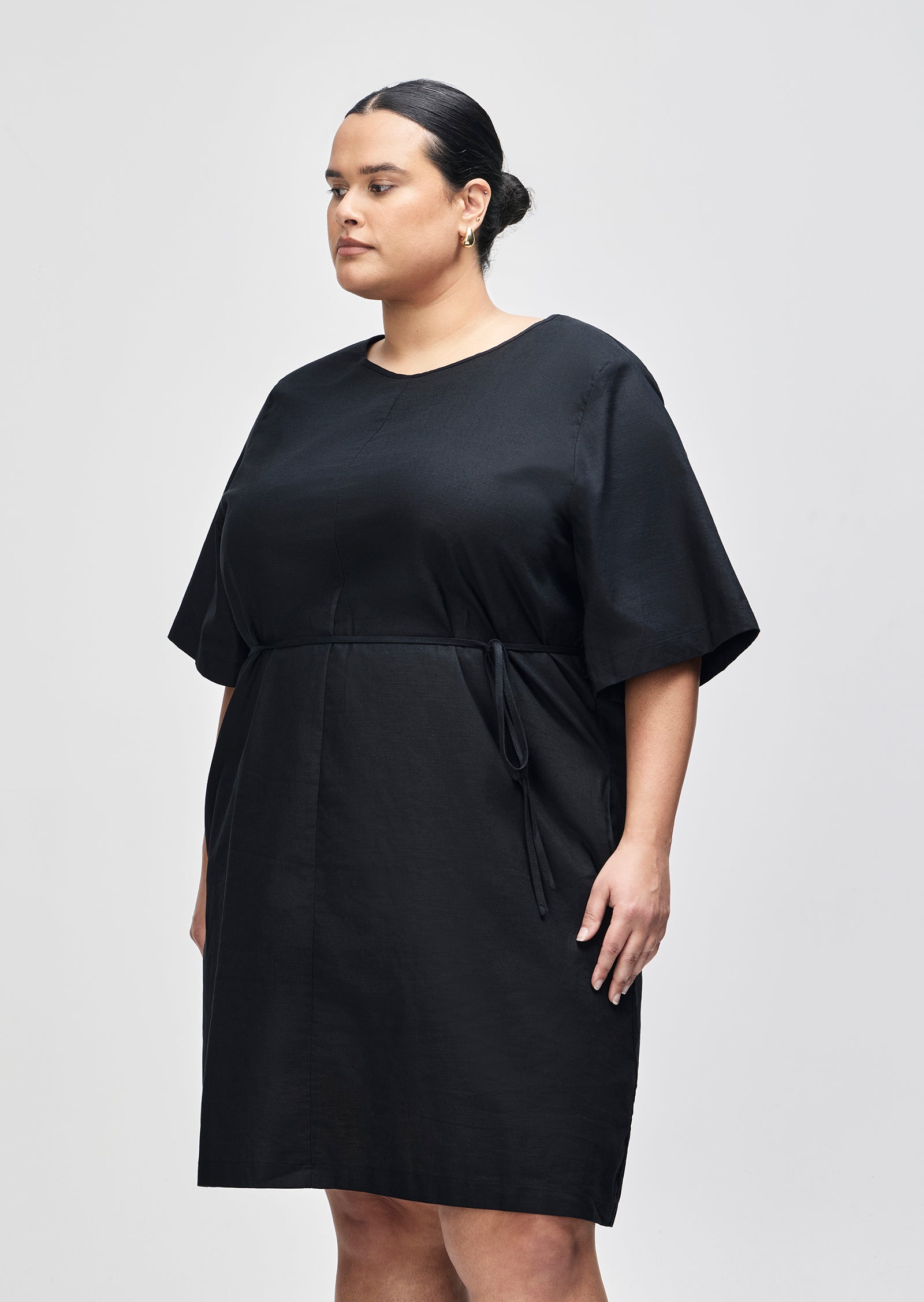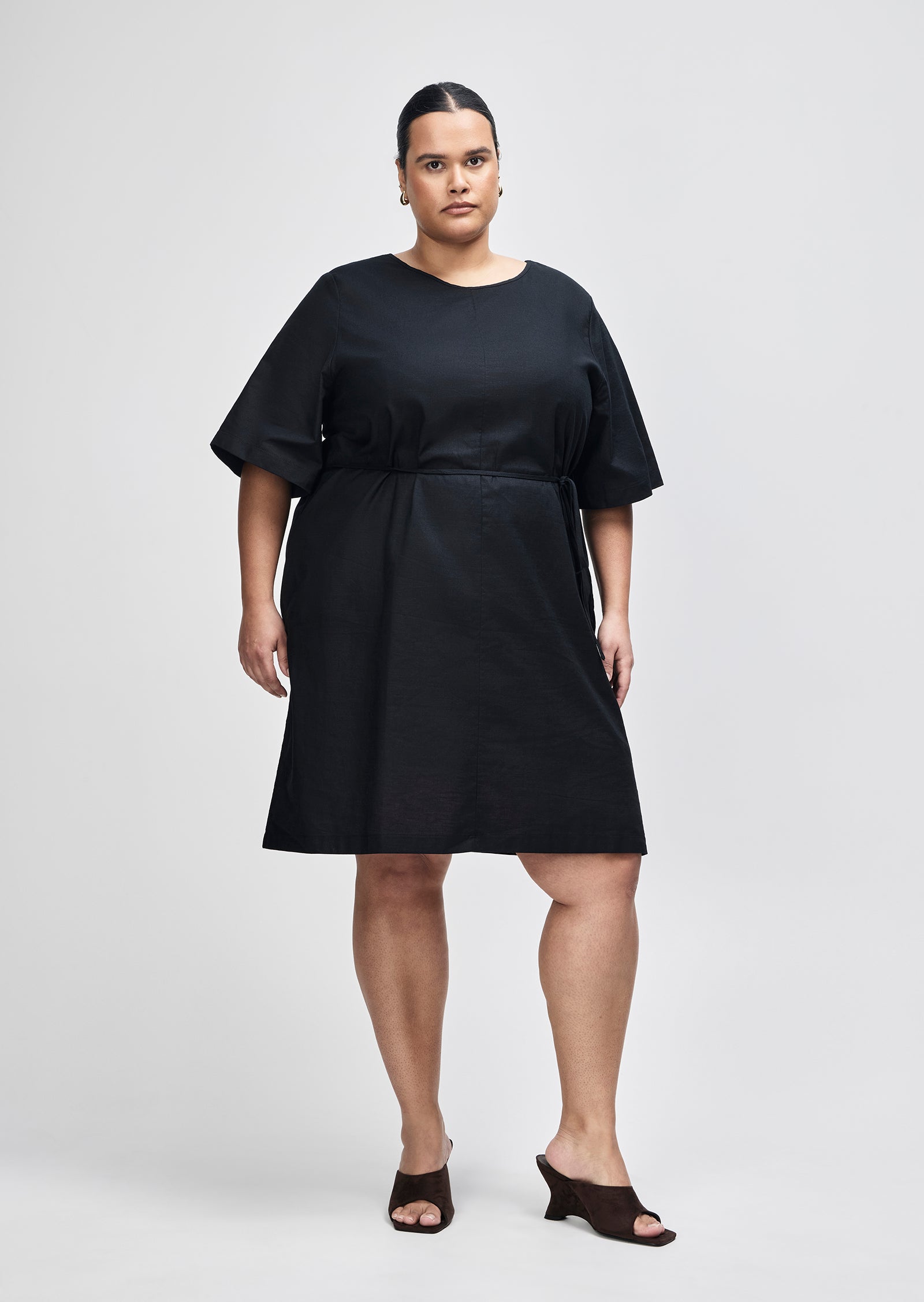 Lucienne includes a centre back neck keyhole, side pockets, and a removable waist tie for flexible styling. The unlined construction keeps it lightweight and breathable.