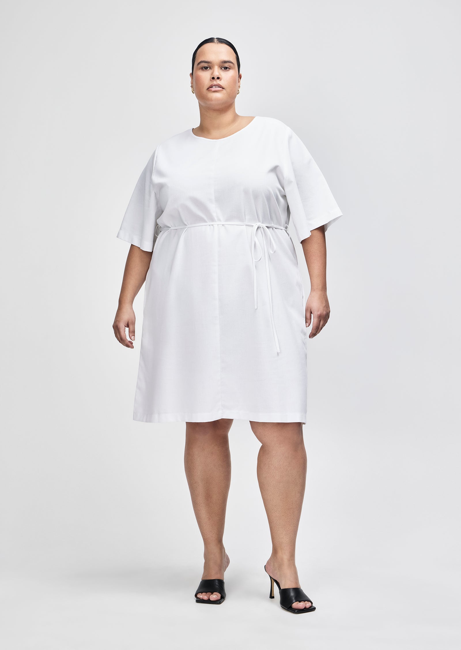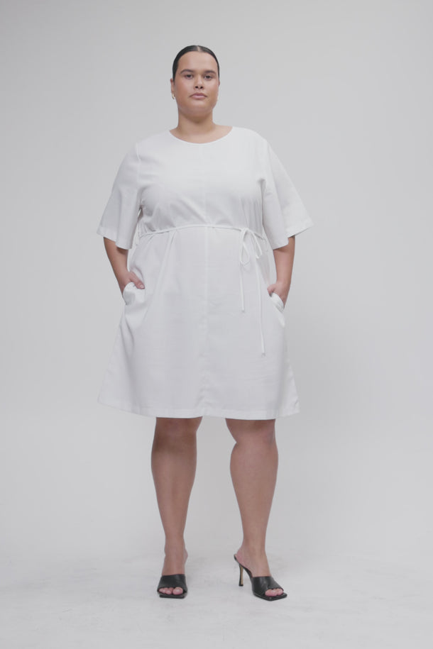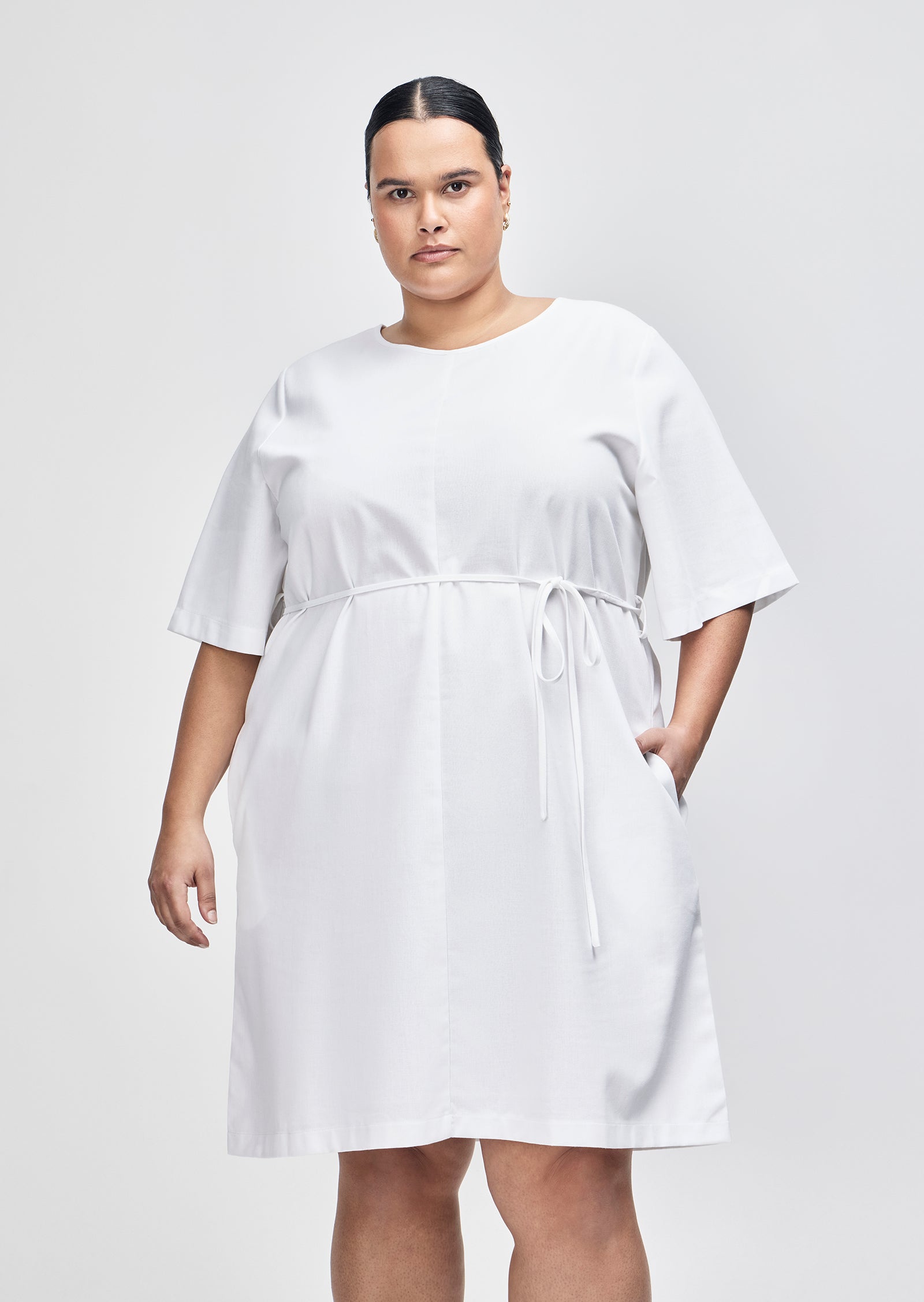 Lucienne includes a centre back neck keyhole, side pockets, and a removable waist tie for flexible styling. The unlined construction keeps it lightweight and breathable.