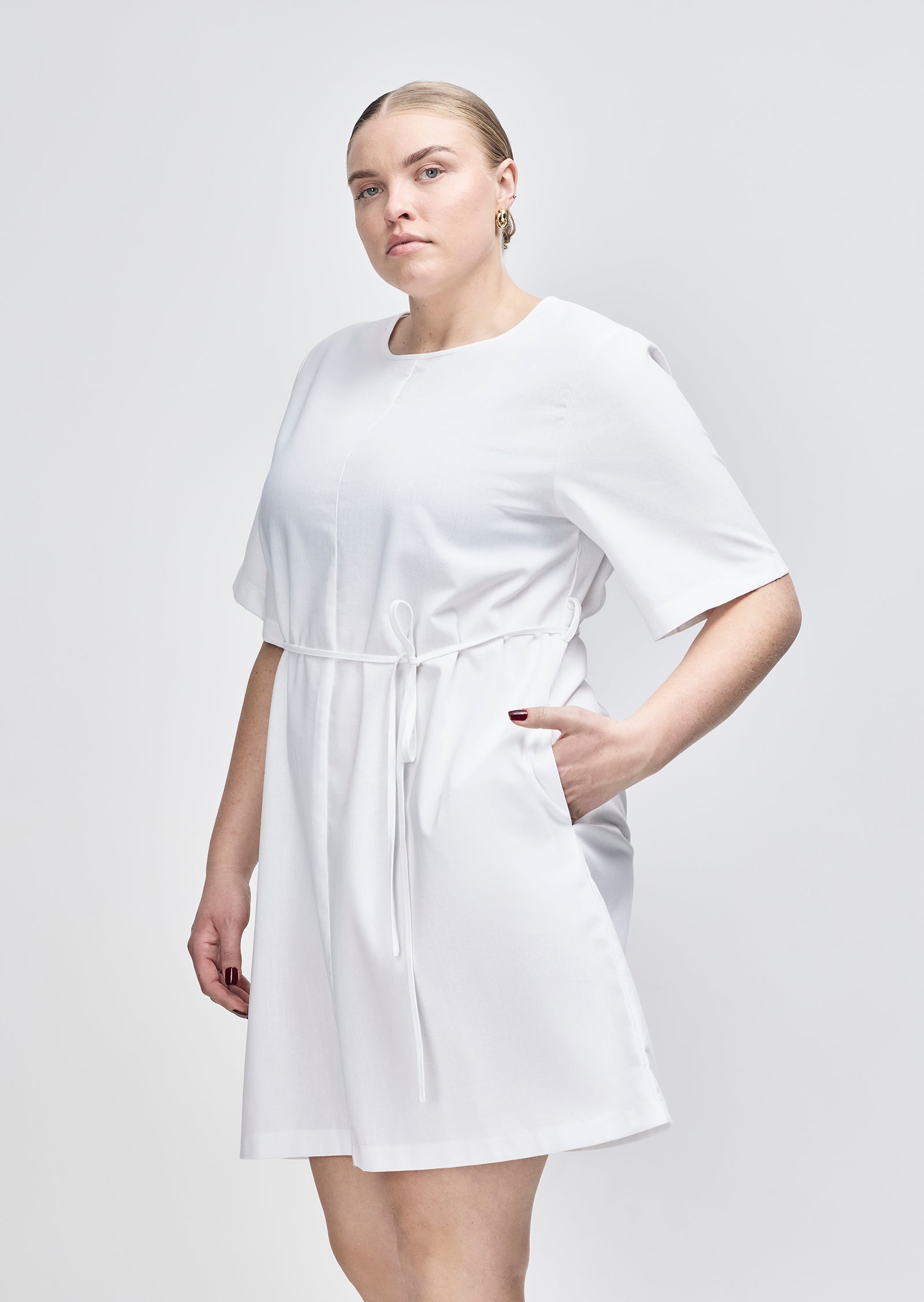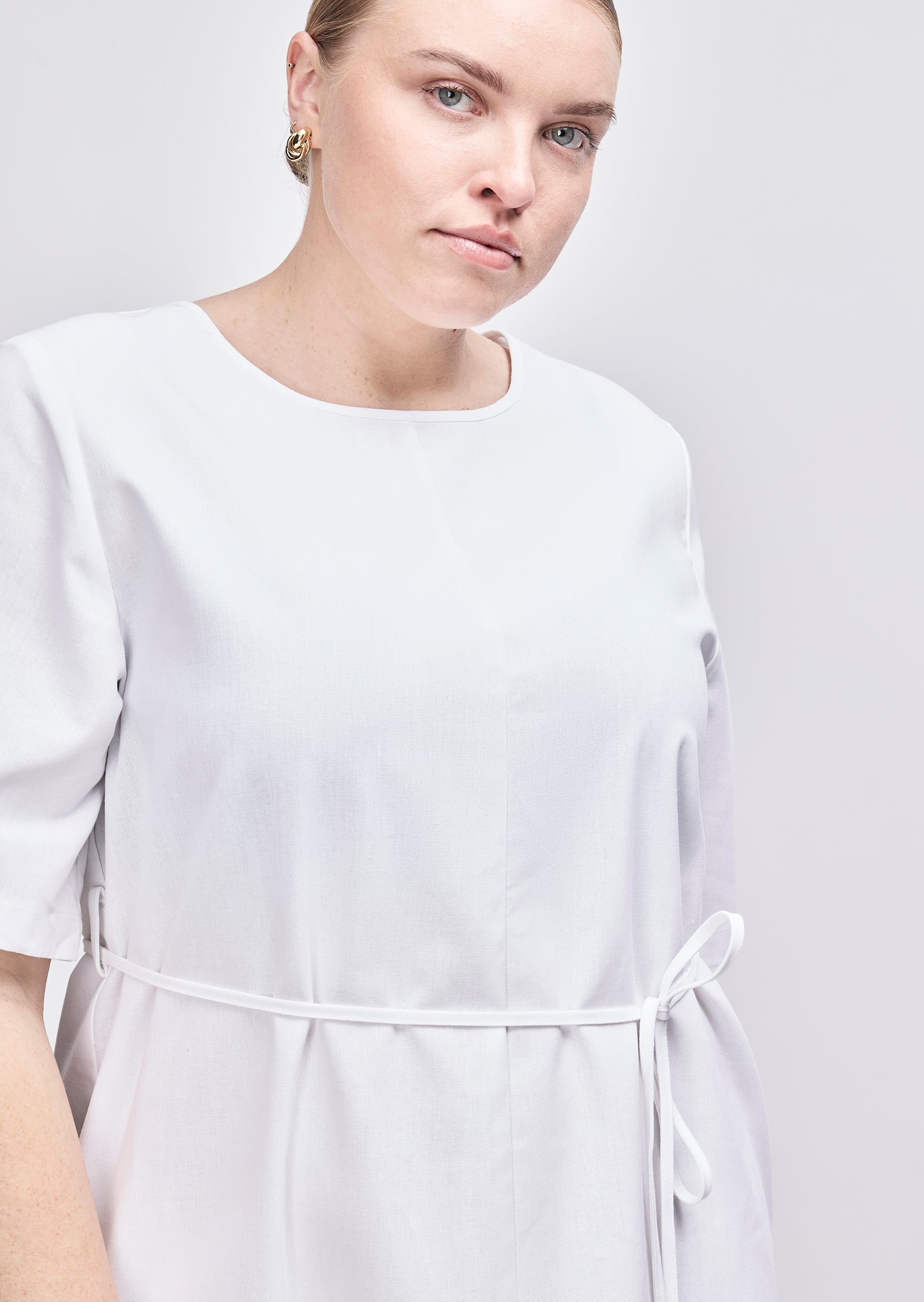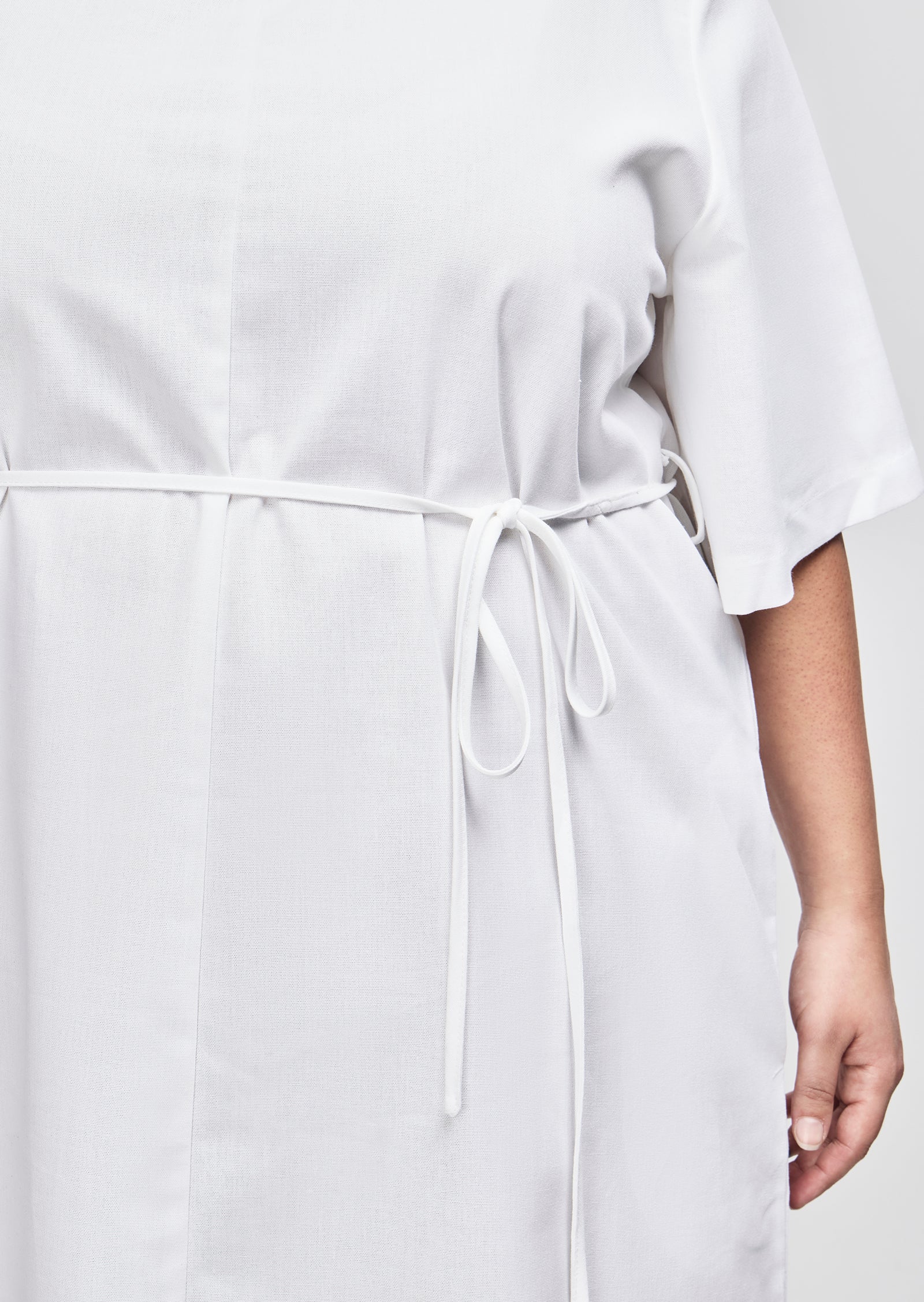 Lucienne includes a centre back neck keyhole, side pockets, and a removable waist tie for flexible styling. The unlined construction keeps it lightweight and breathable.