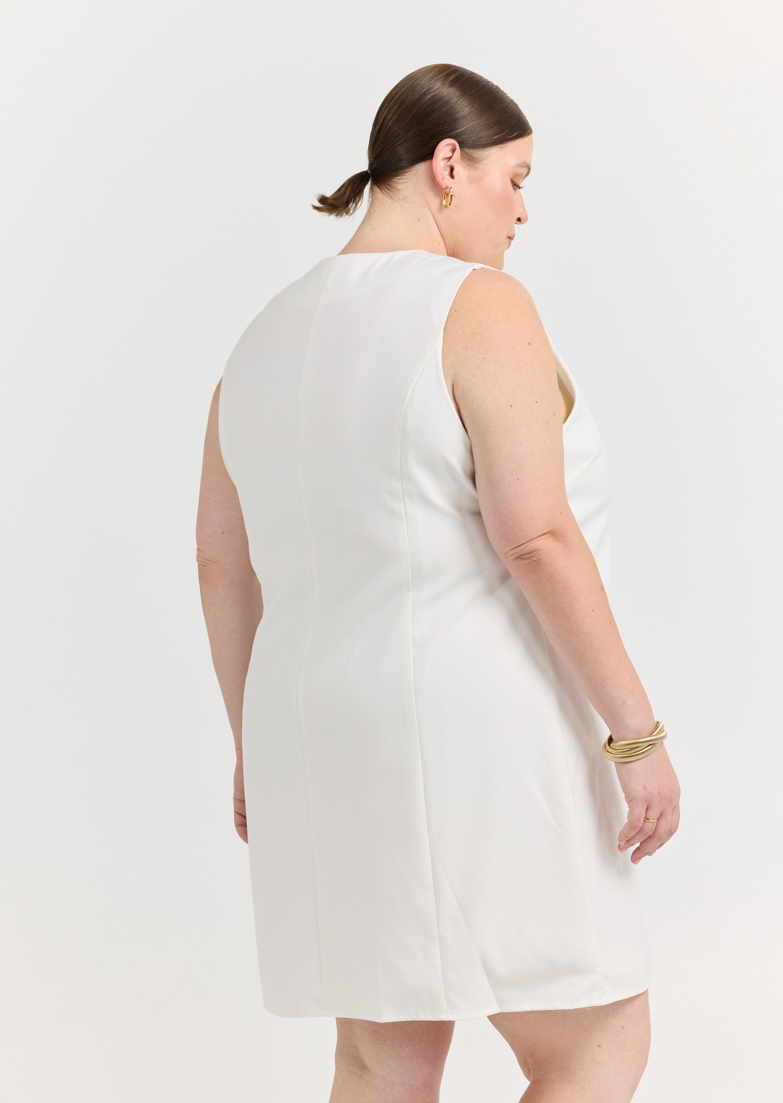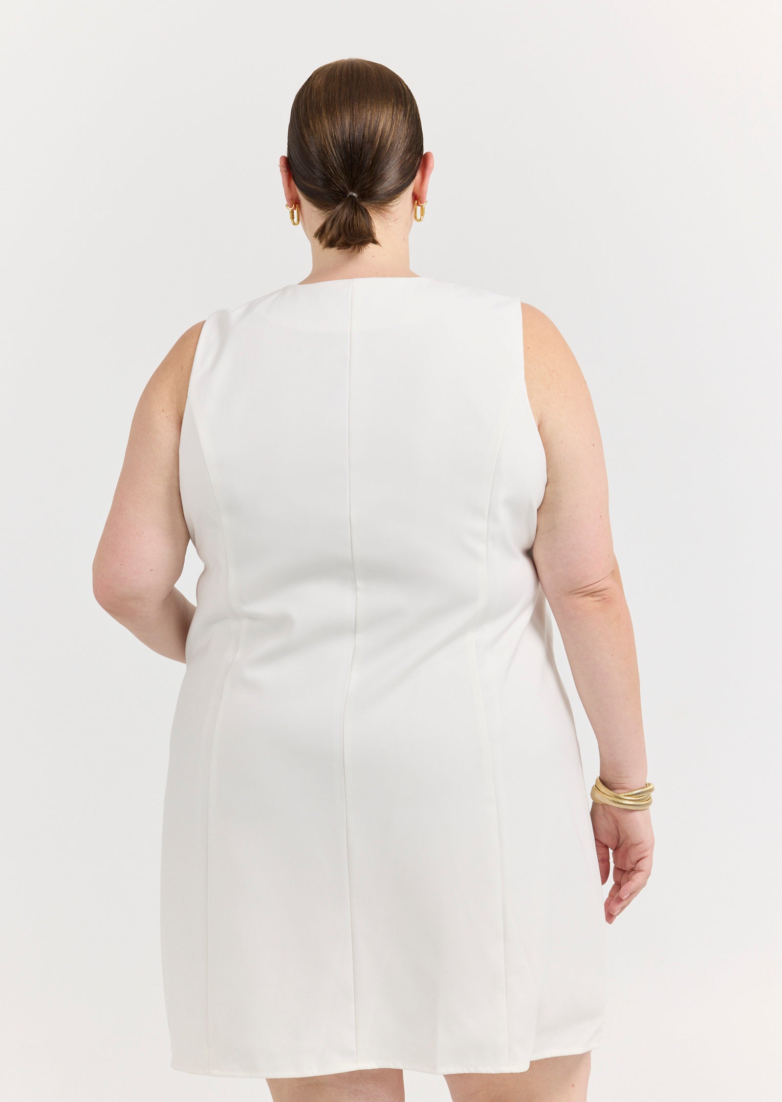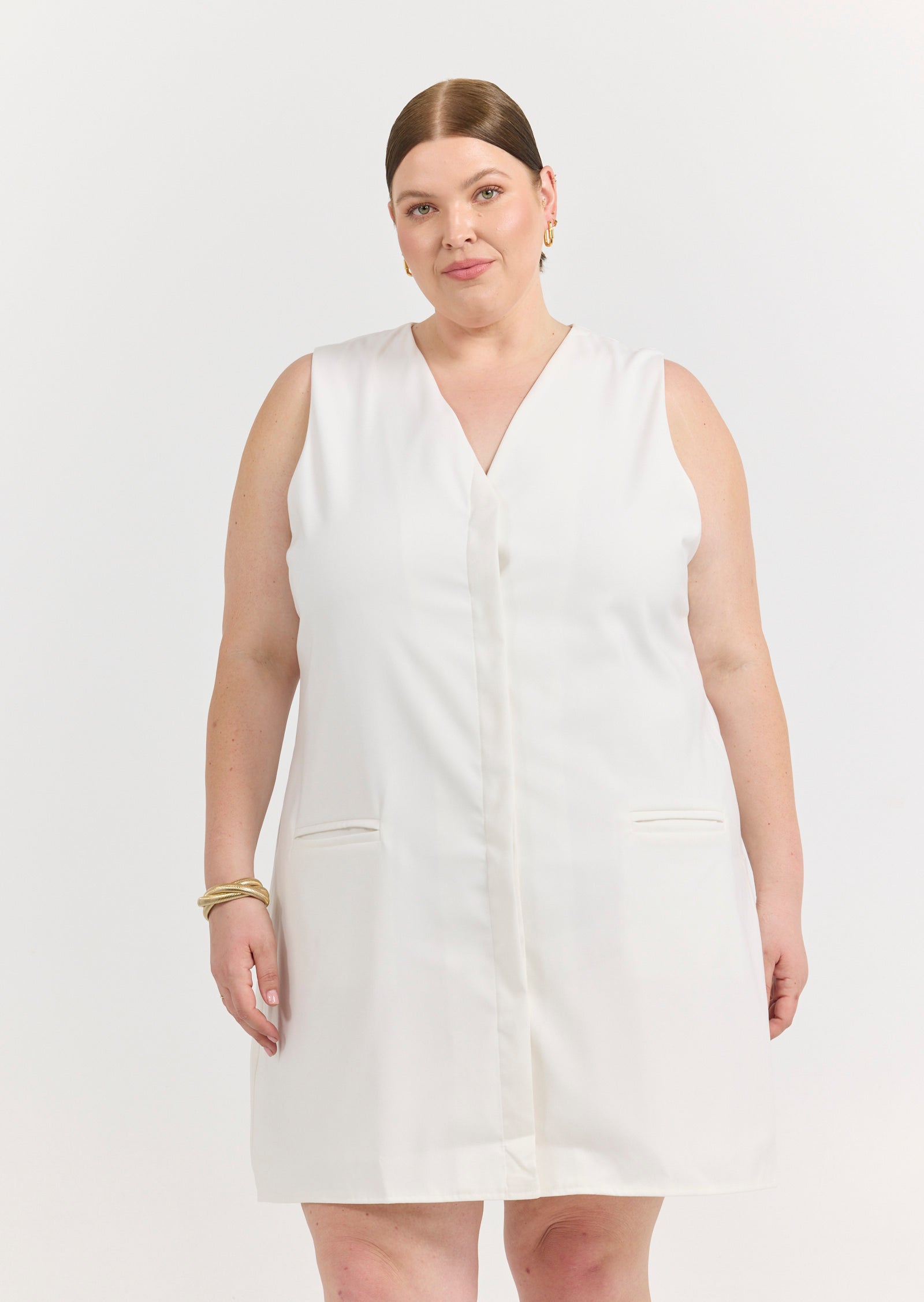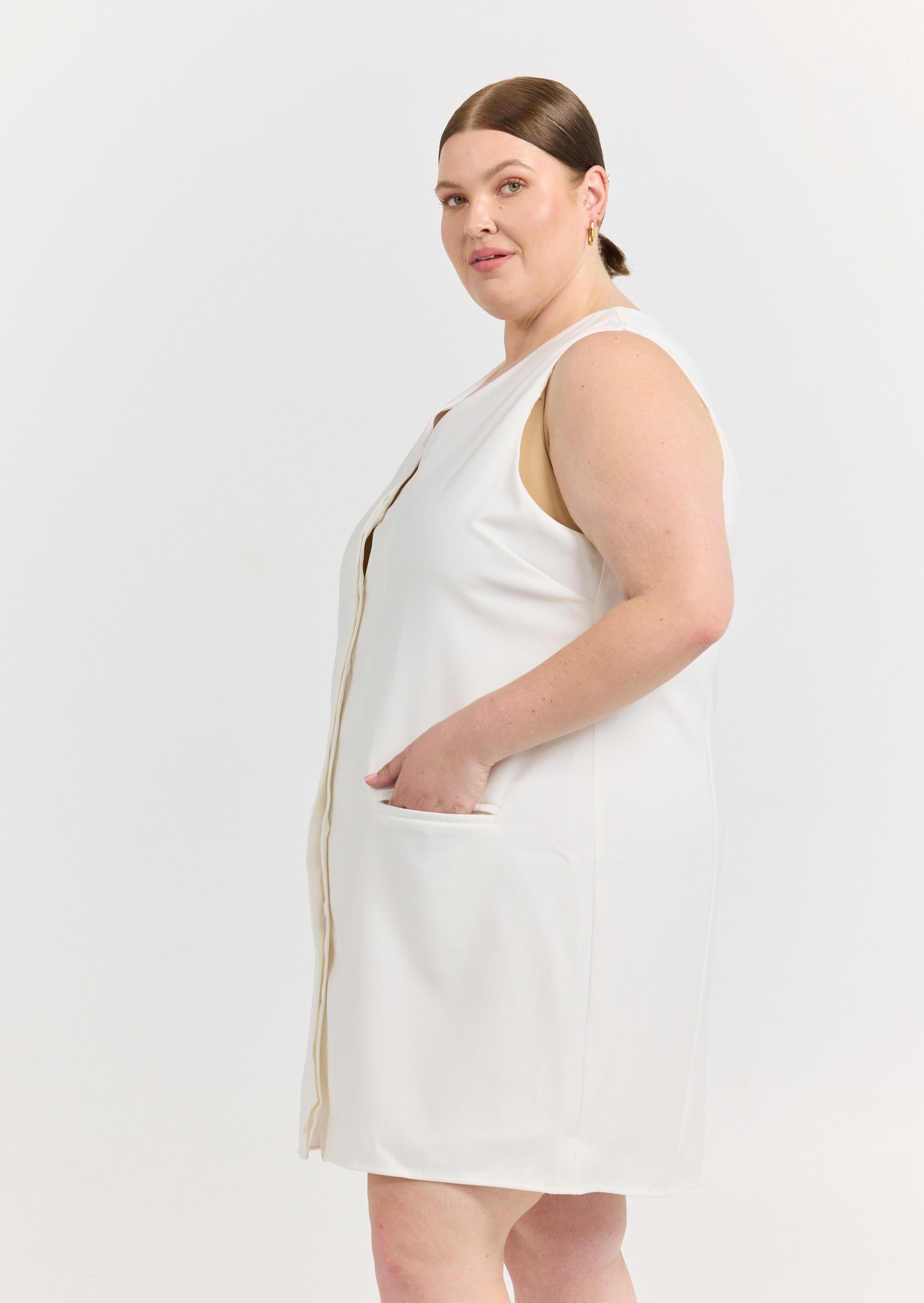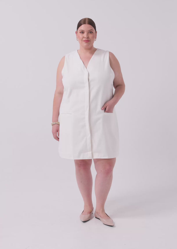 Meet the Odette Mini Vest Dress - a contemporary statement piece made for size inclusive layering. Designed for sizes 14-24, this cream vest dress brings tailored attitude and minimalist elegance to your wardrobe.