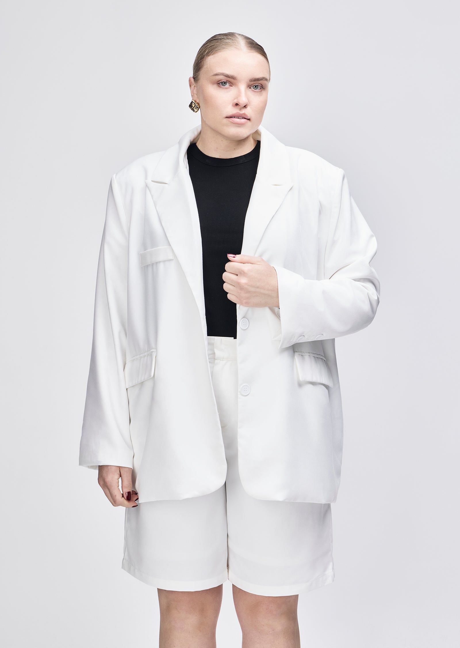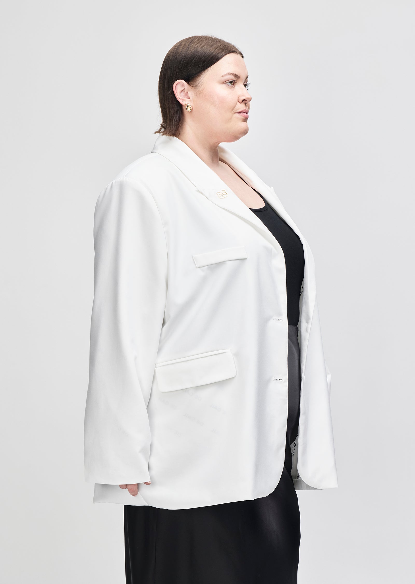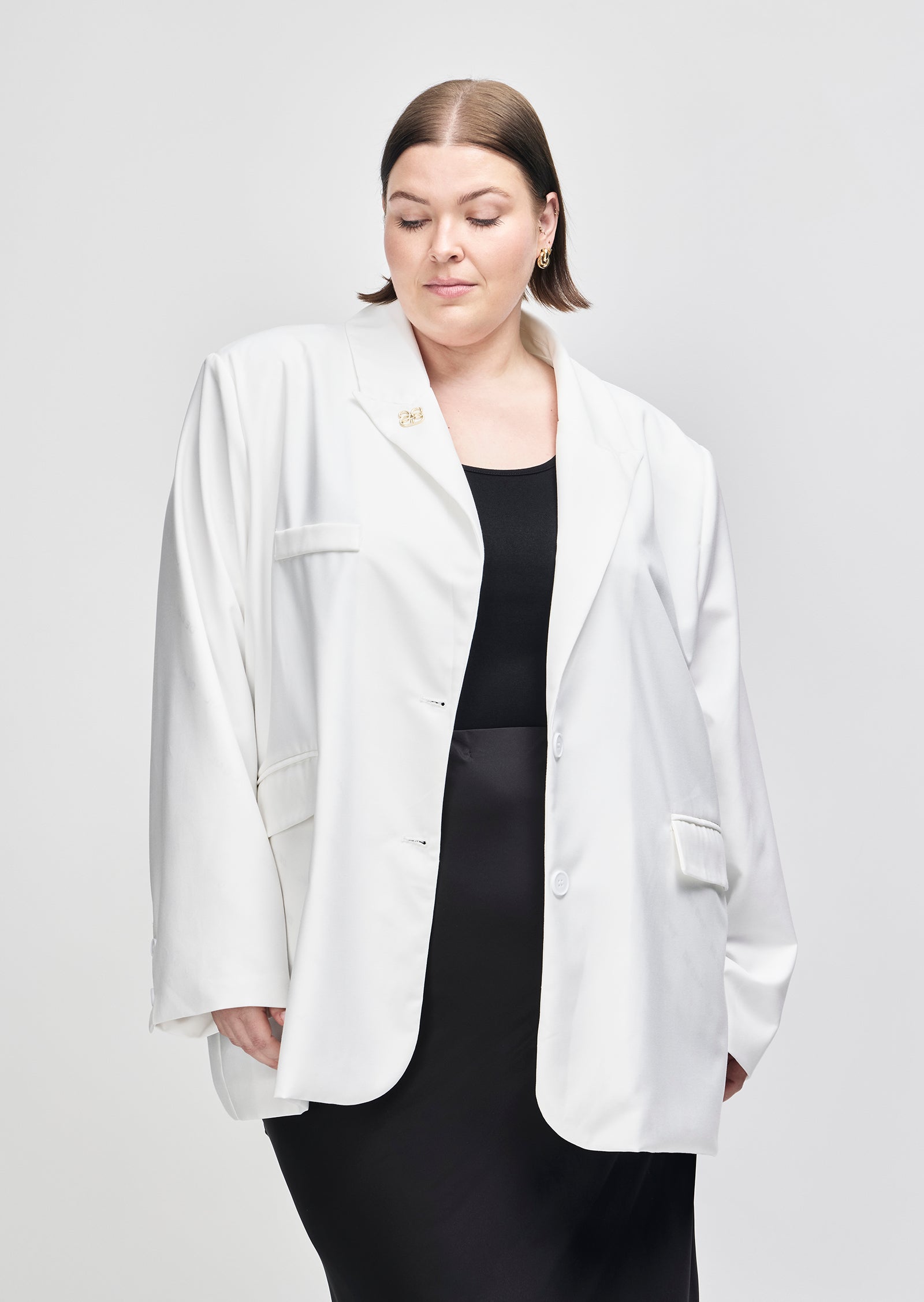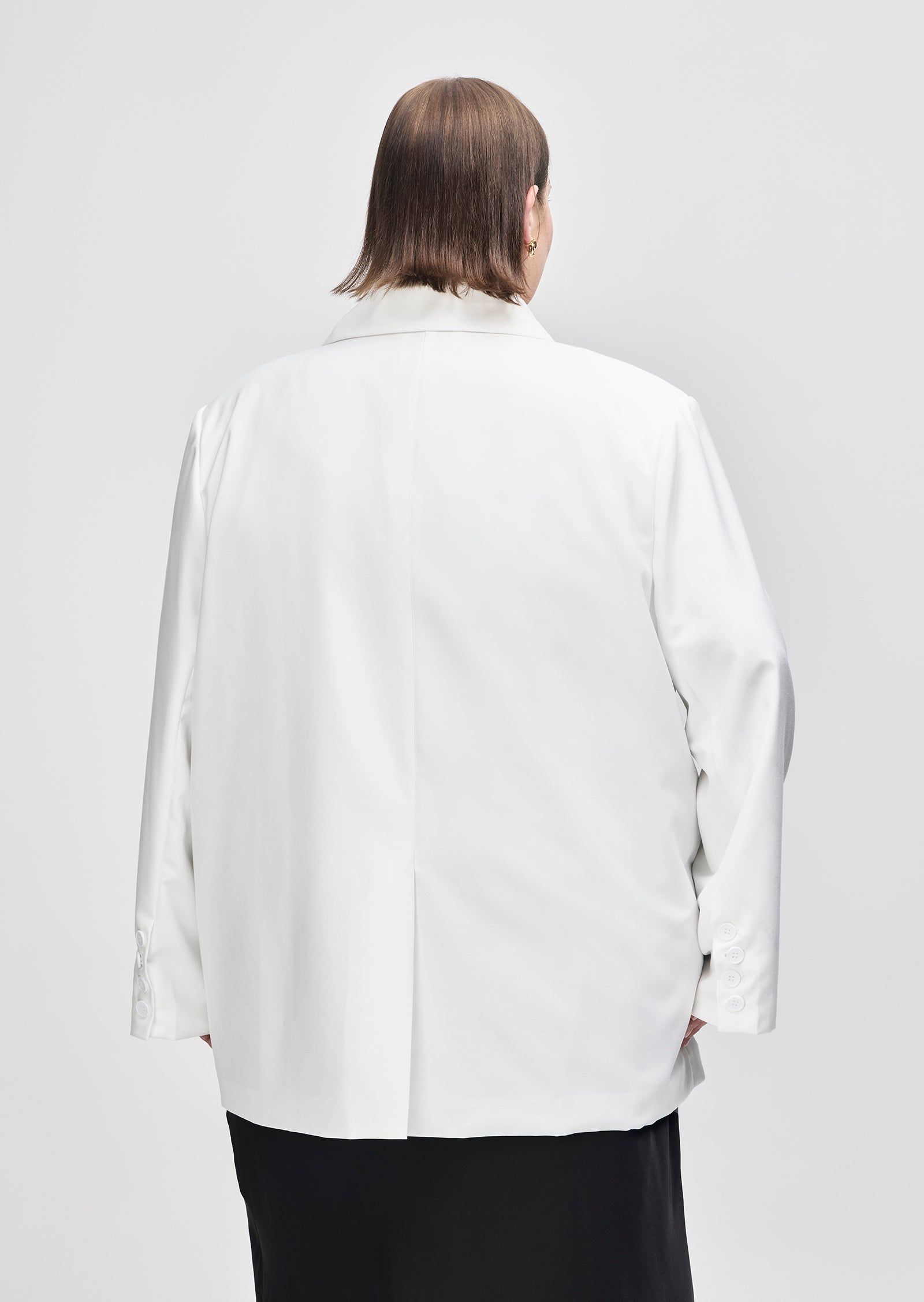 Cut in a structured black suiting fabric, it features a sharp lapel, front pockets, and fluid drape through the body. The fit is intentionally oversized without overwhelming your shape.
