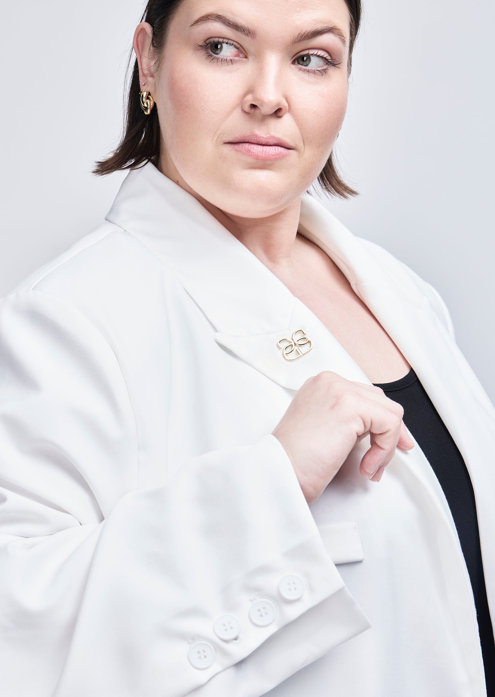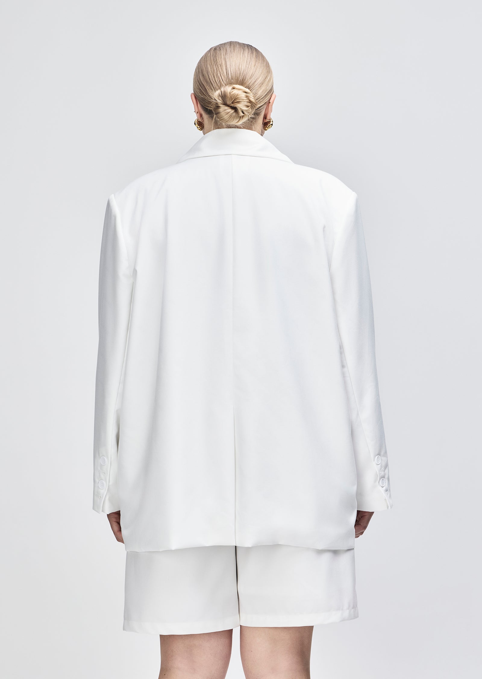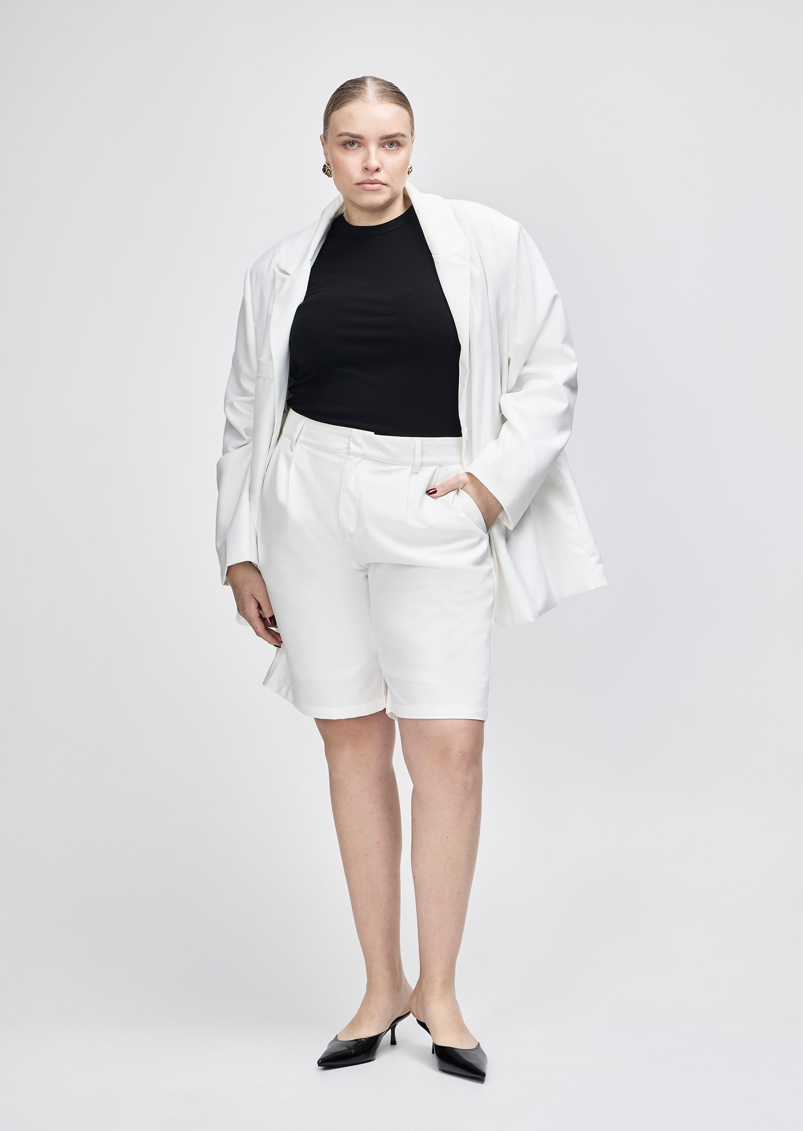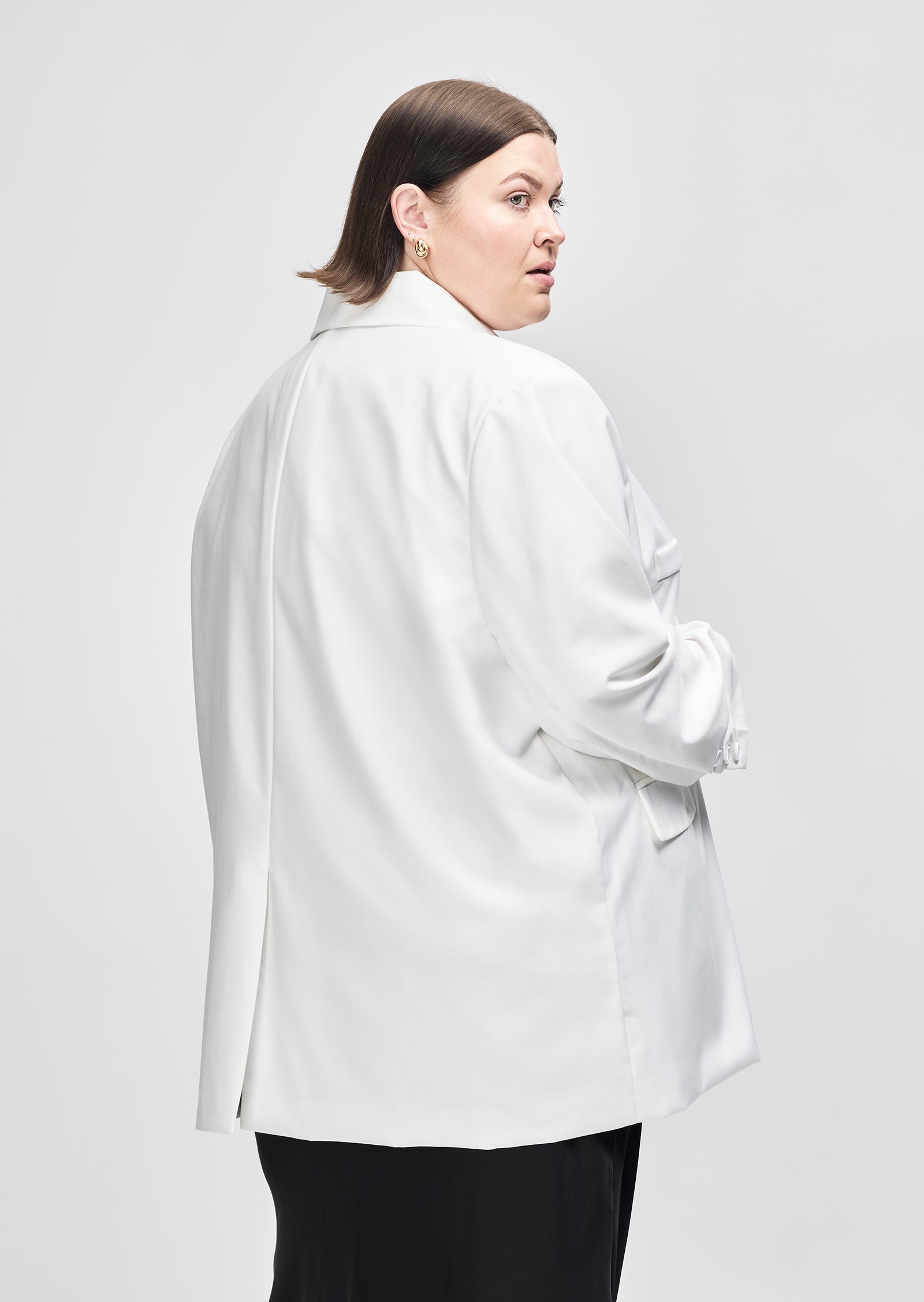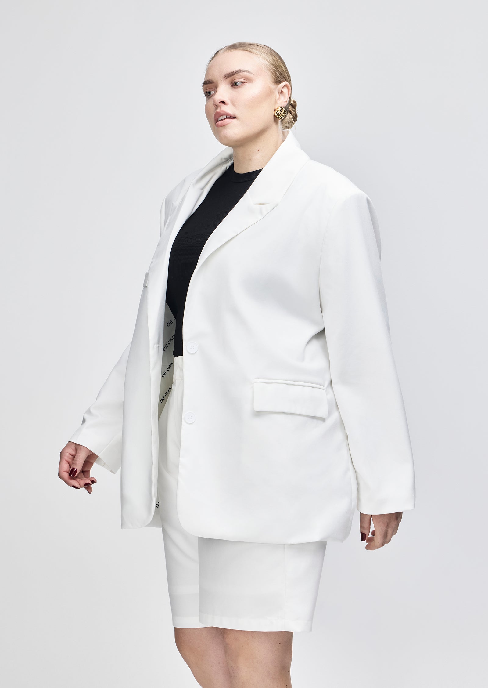 Cut in a structured black suiting fabric, it features a sharp lapel, front pockets, and fluid drape through the body. The fit is intentionally oversized without overwhelming your shape.