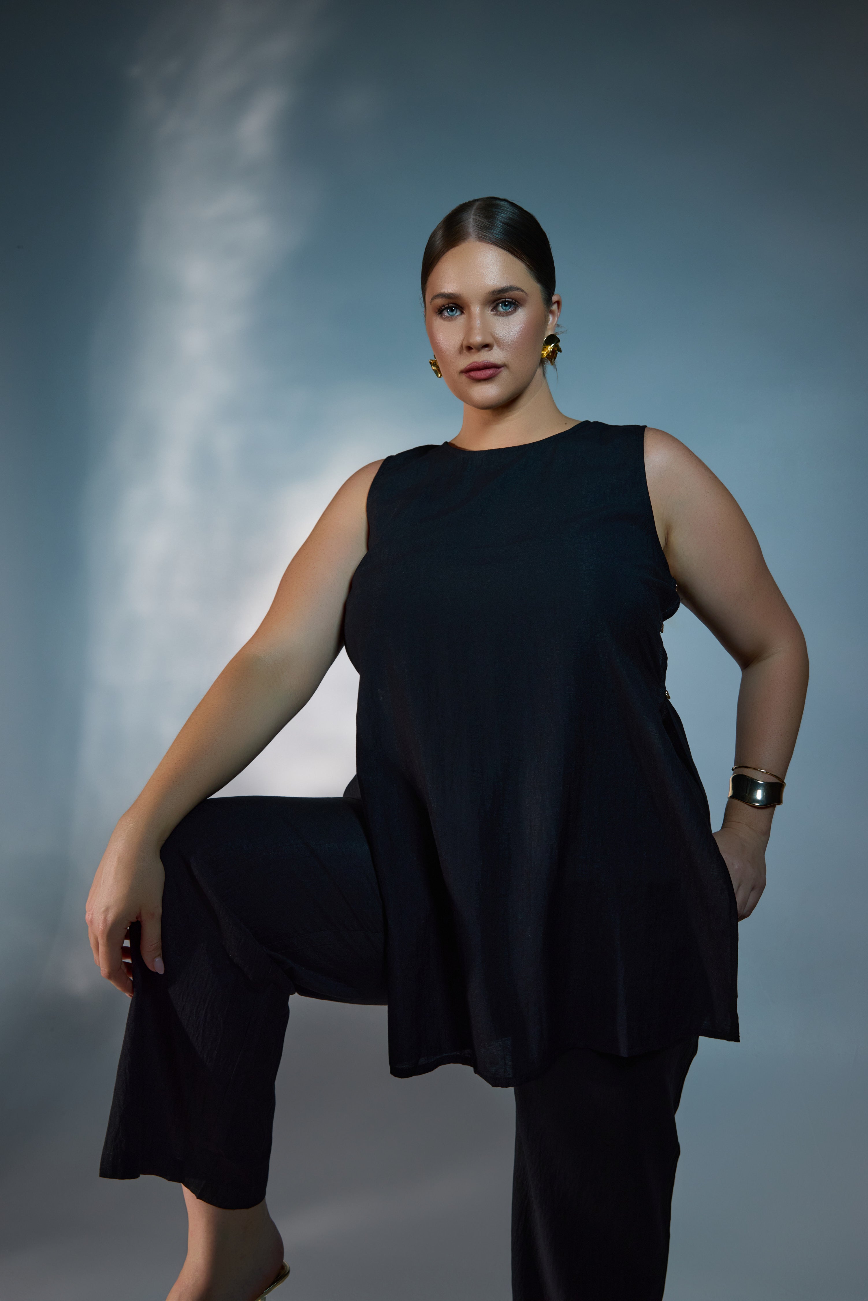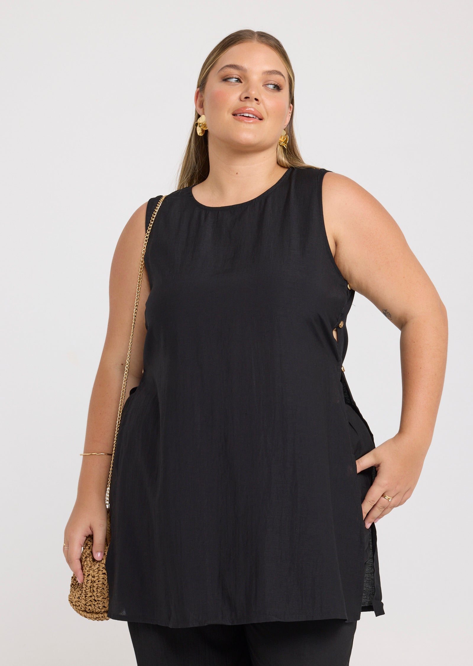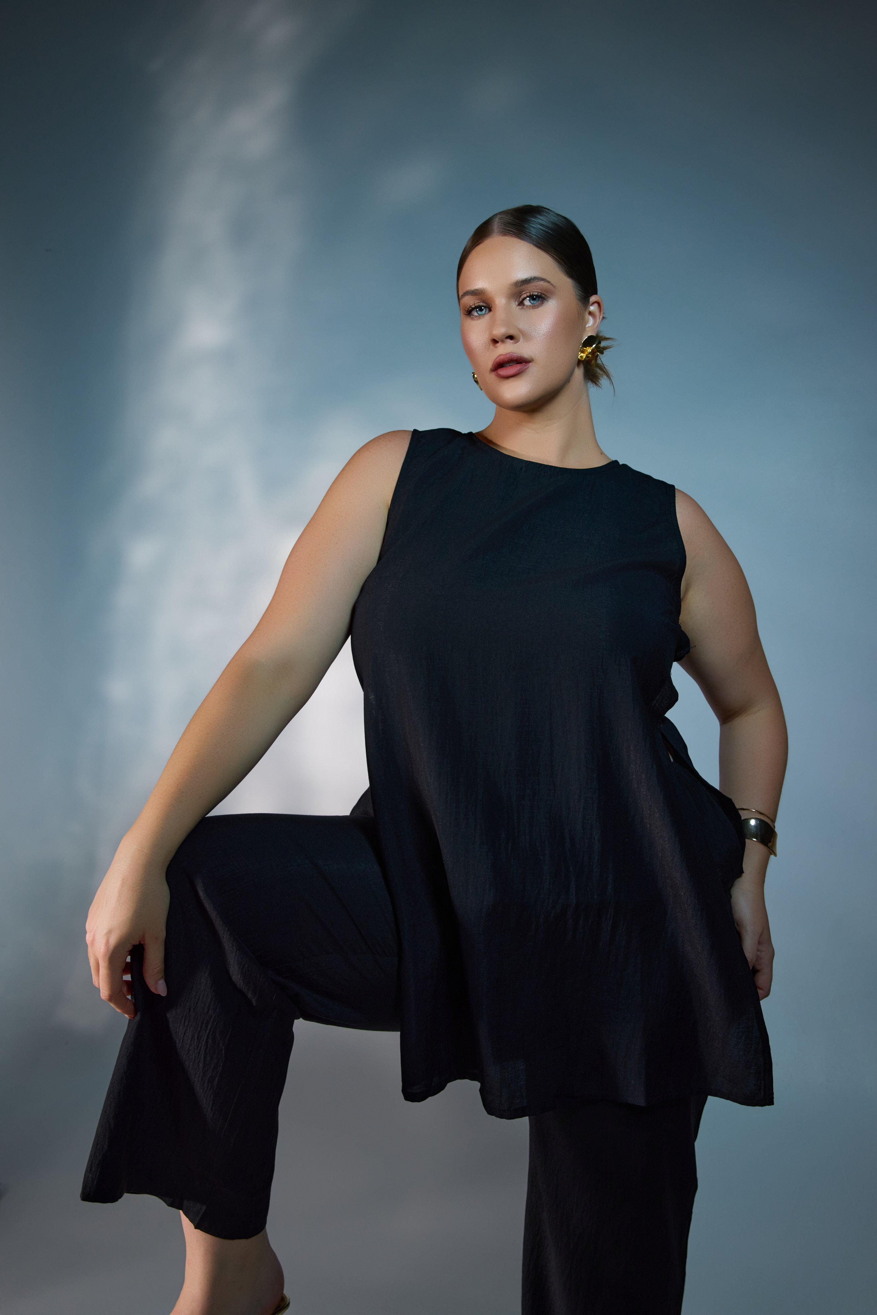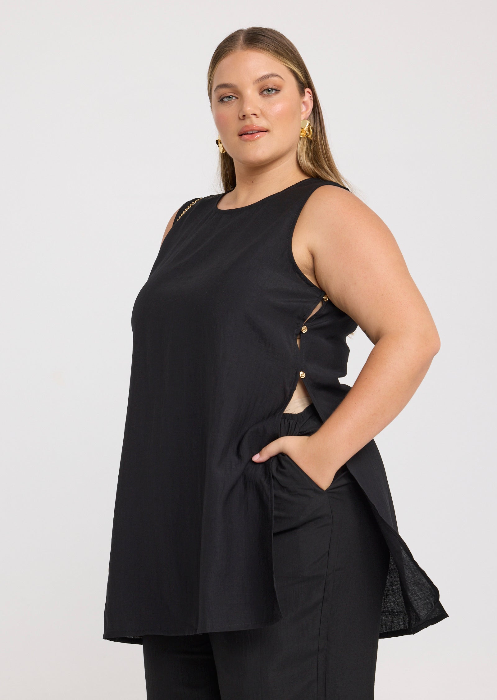 Featuring a sleeveless design with a round neckline, Evita is finished with subtle side split details and decorative button accents for a considered touch. The longer length makes it ideal for pairing with matching pants or styling over slim silhouettes for a balanced, polished outfit.