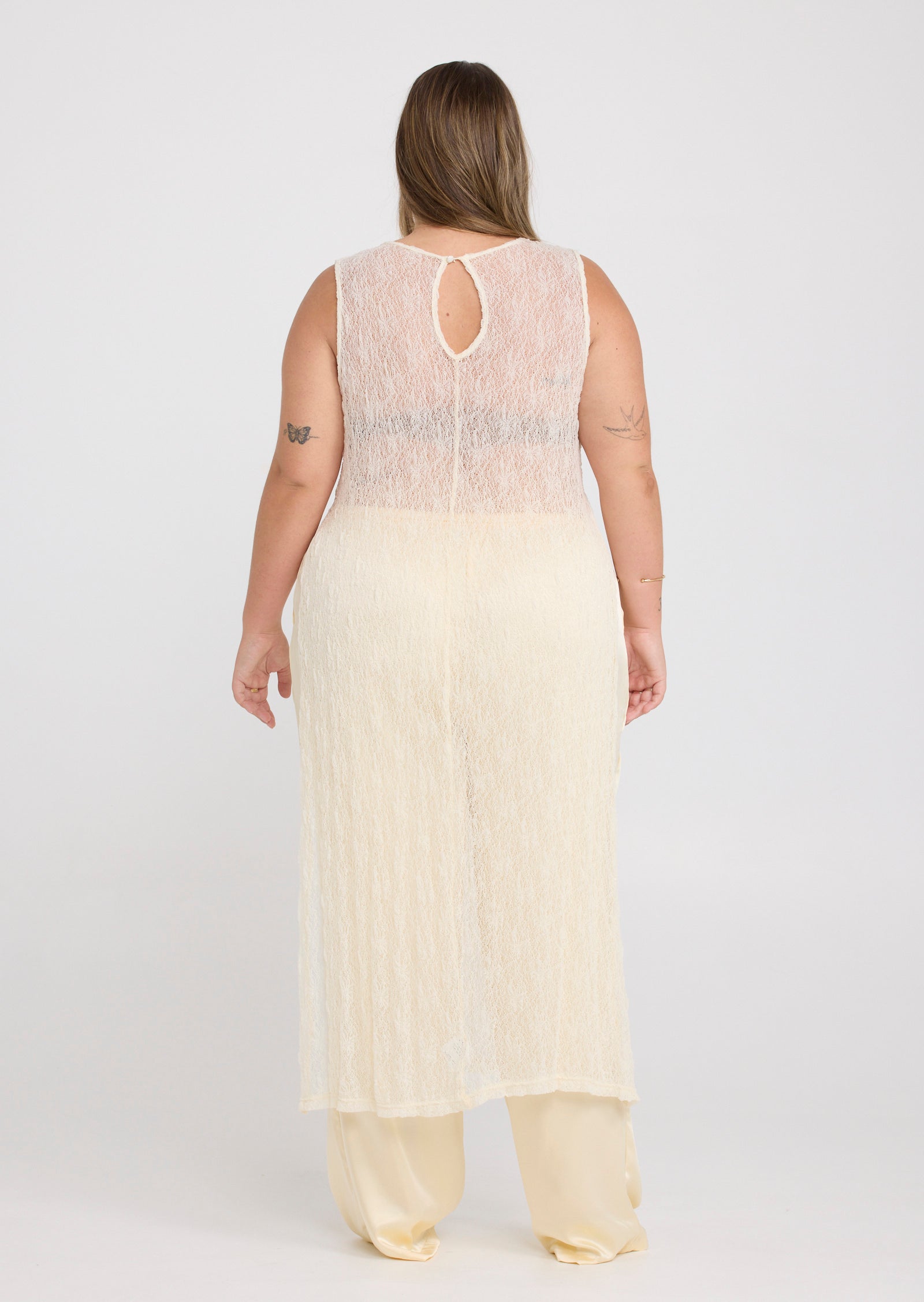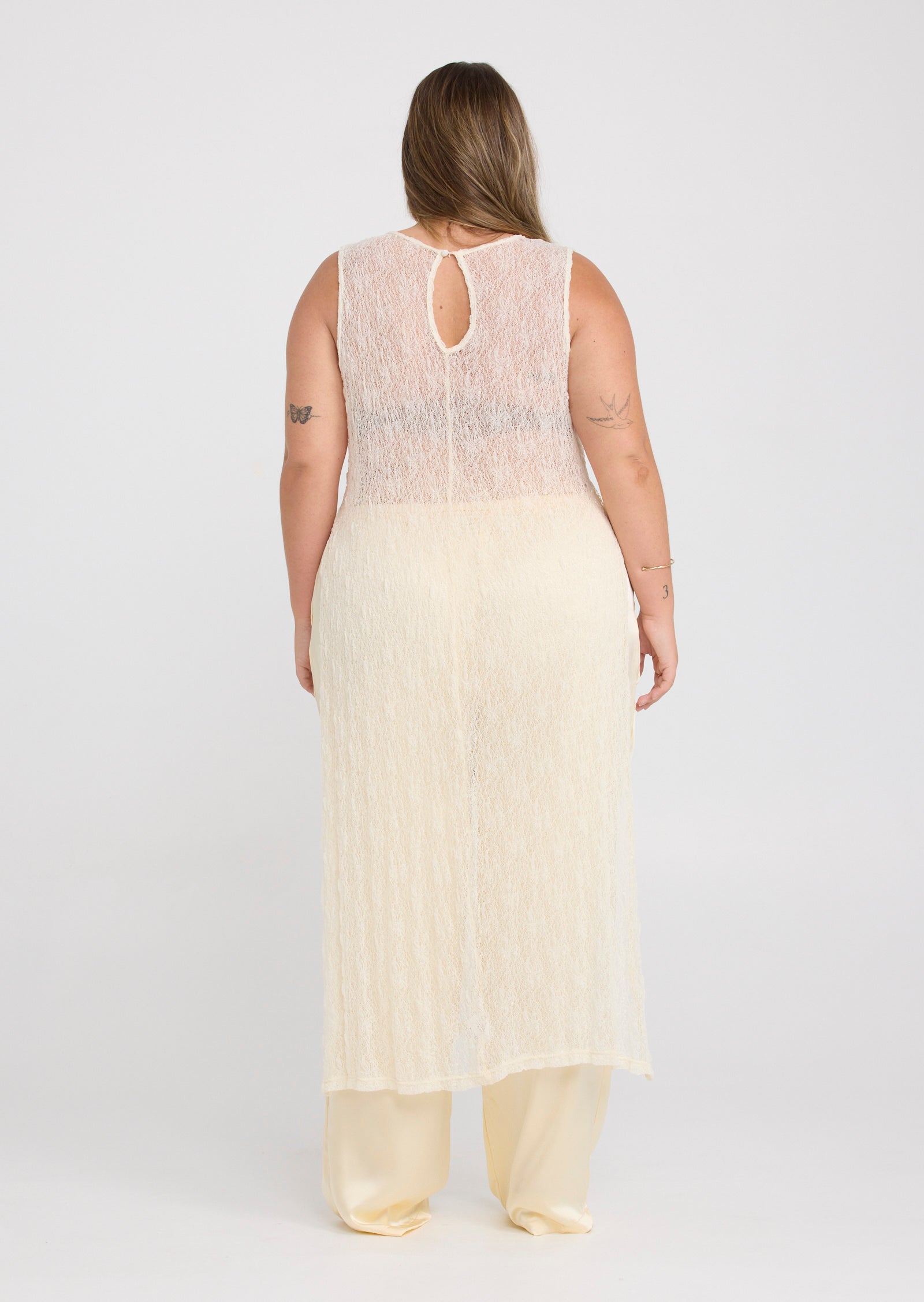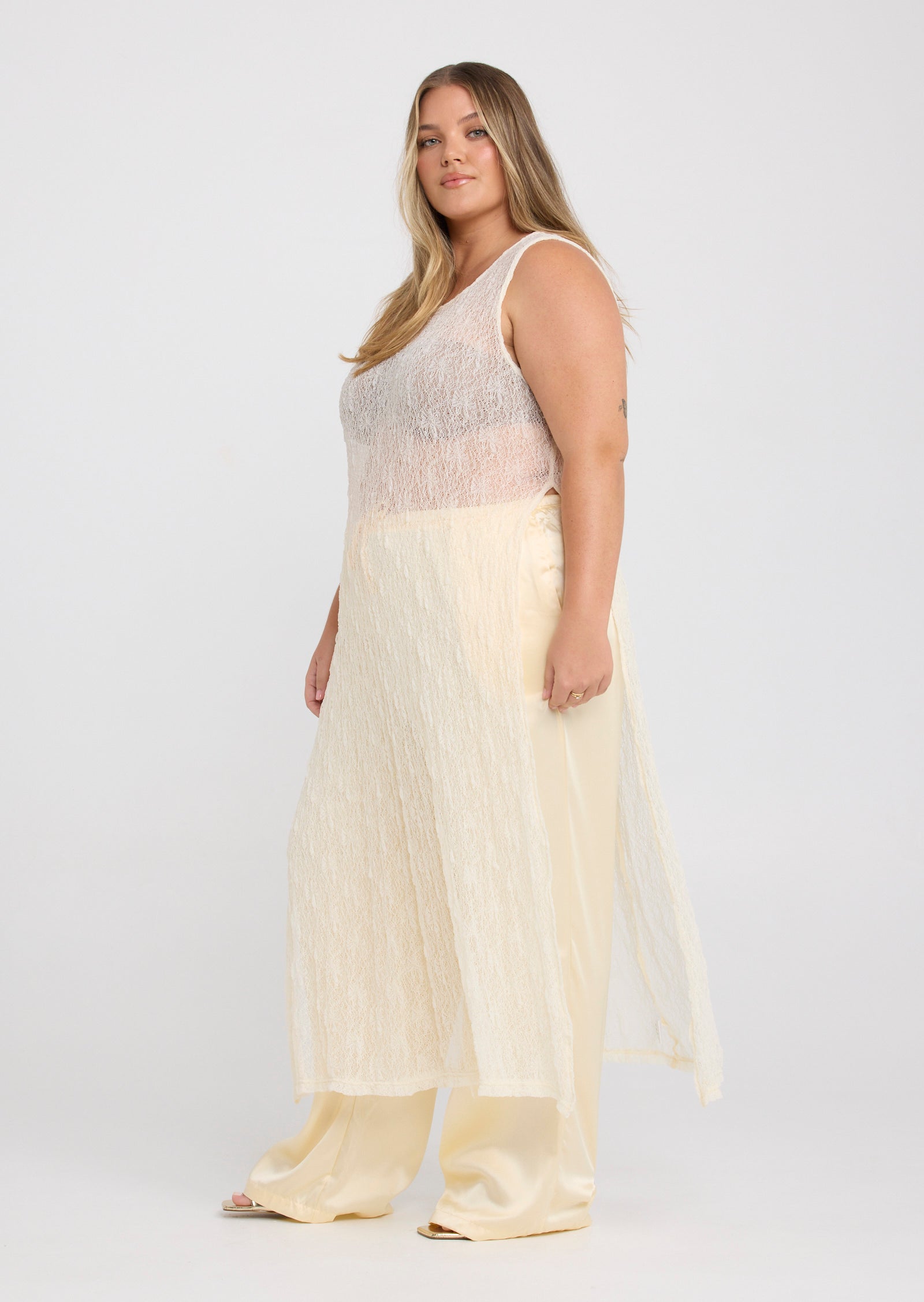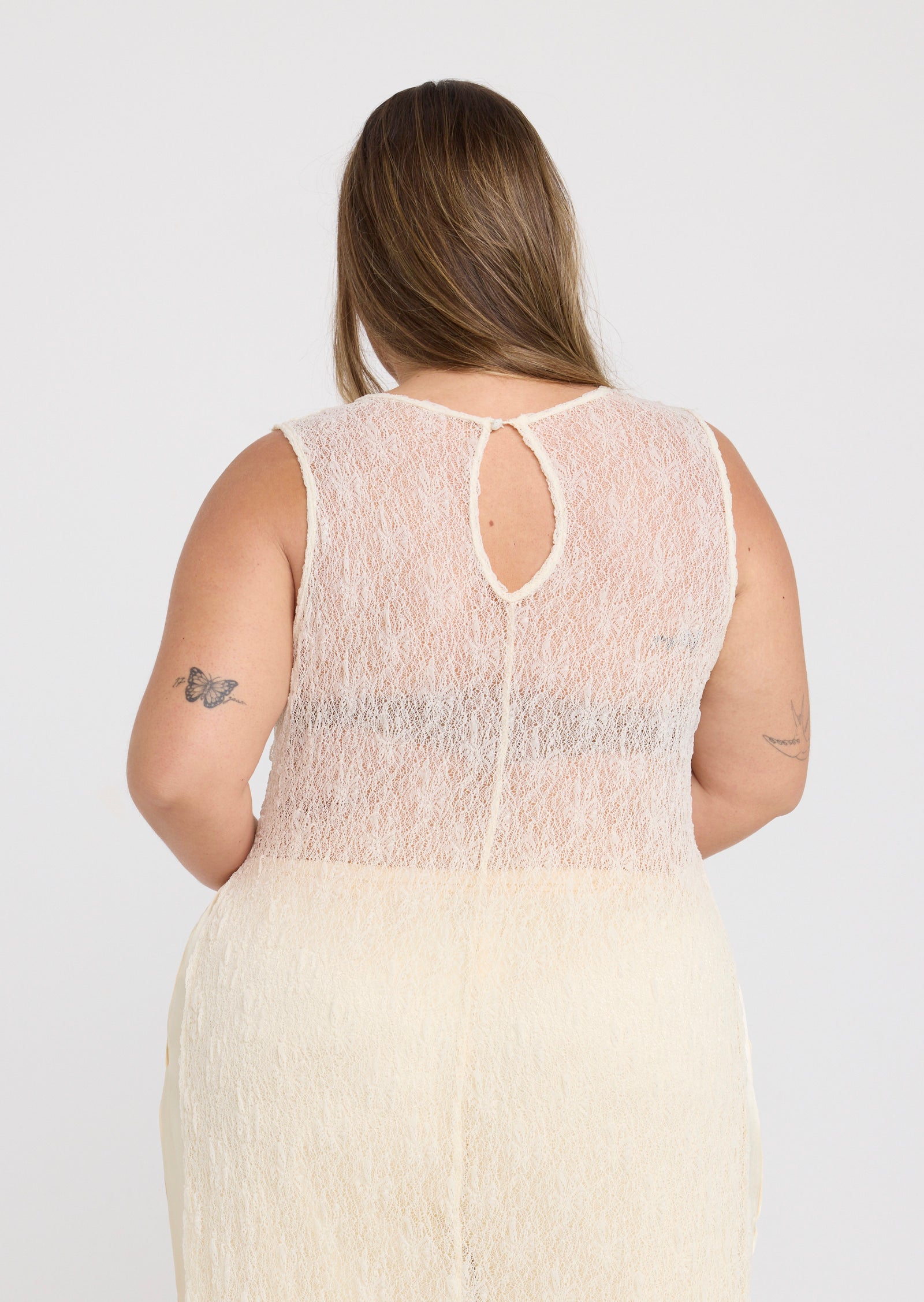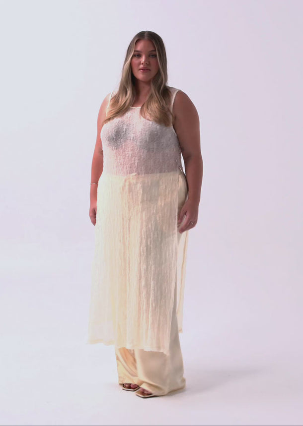 Designed in a lightweight mesh fabrication, Jolie features a classic round neckline with a button and loop keyhole closure at the back. Side splits add movement through the hem, while the versatile construction allows the front and back panels to be tied at the side for a subtle, considered detail that elevates the overall look.