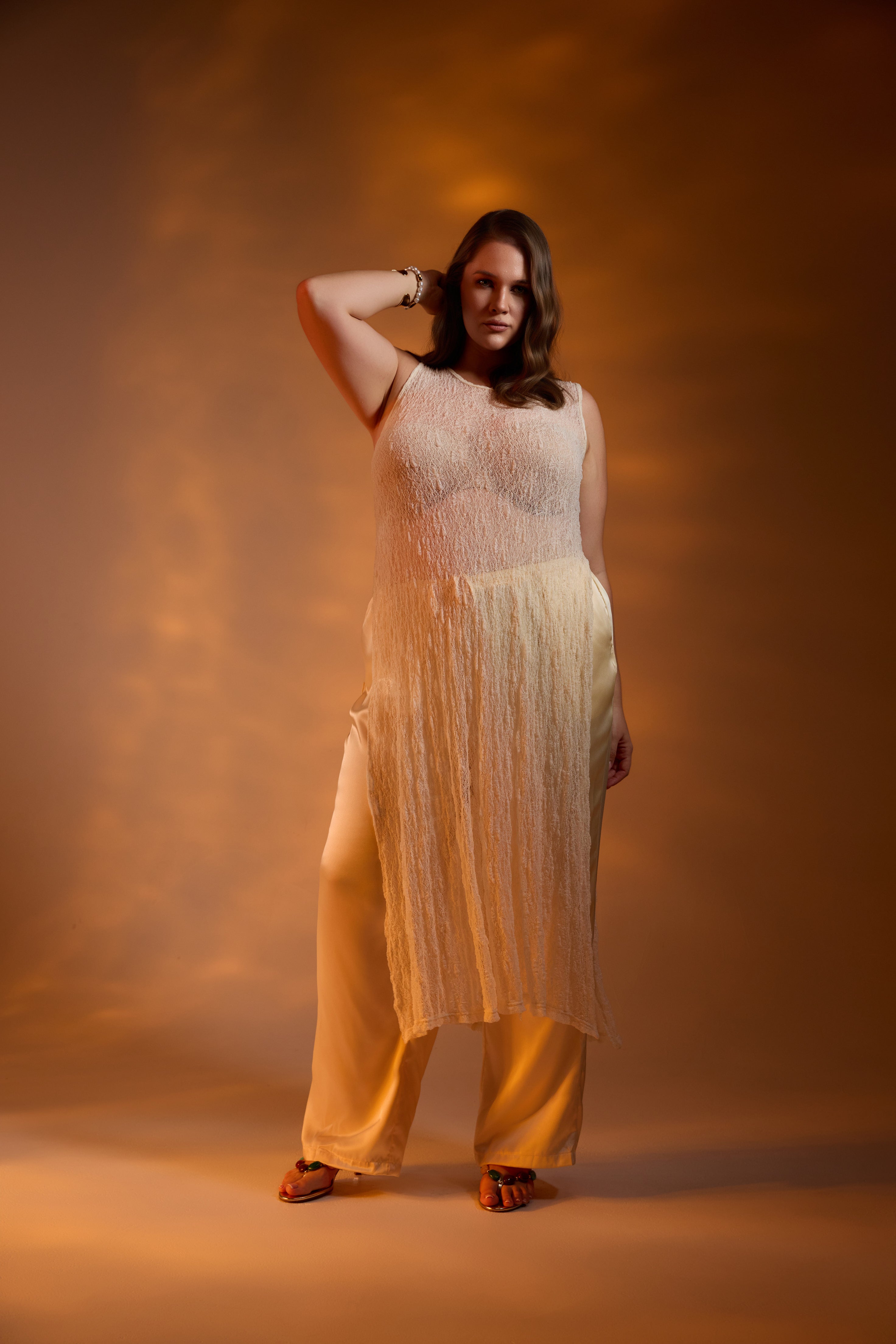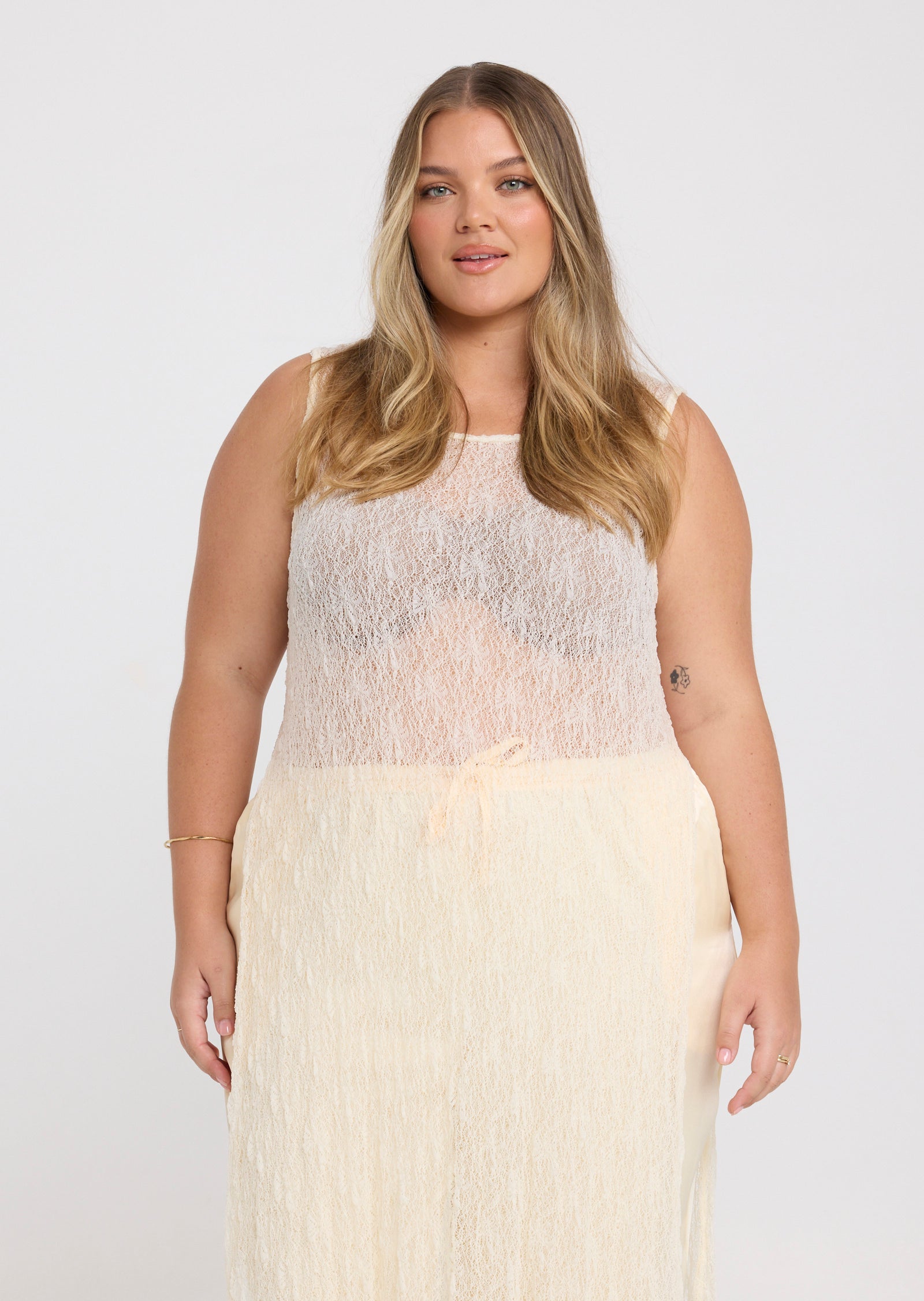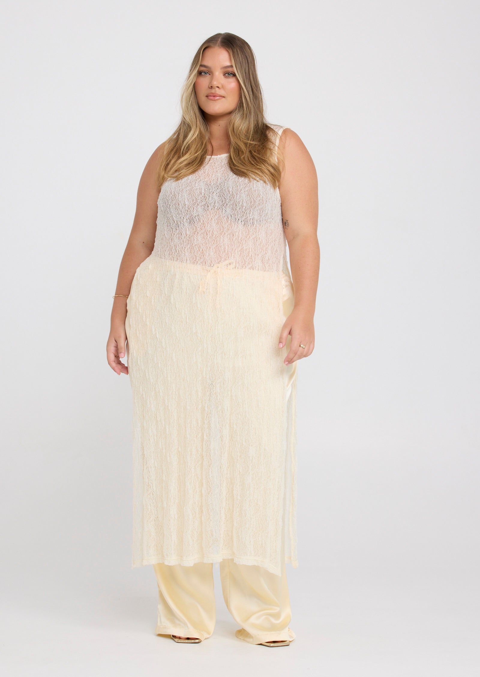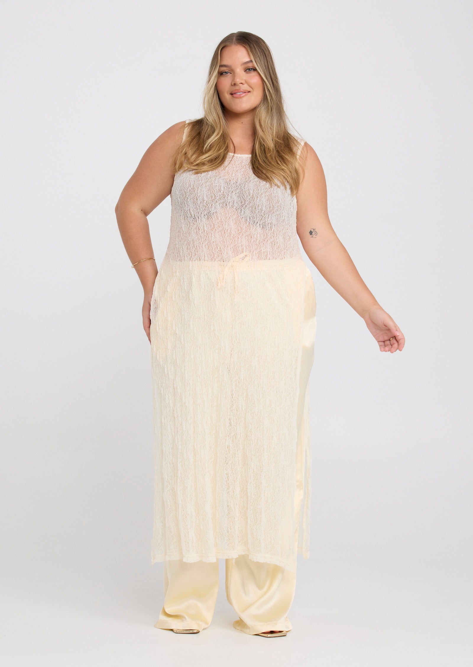 Designed in a lightweight mesh fabrication, Jolie features a classic round neckline with a button and loop keyhole closure at the back. Side splits add movement through the hem, while the versatile construction allows the front and back panels to be tied at the side for a subtle, considered detail that elevates the overall look.