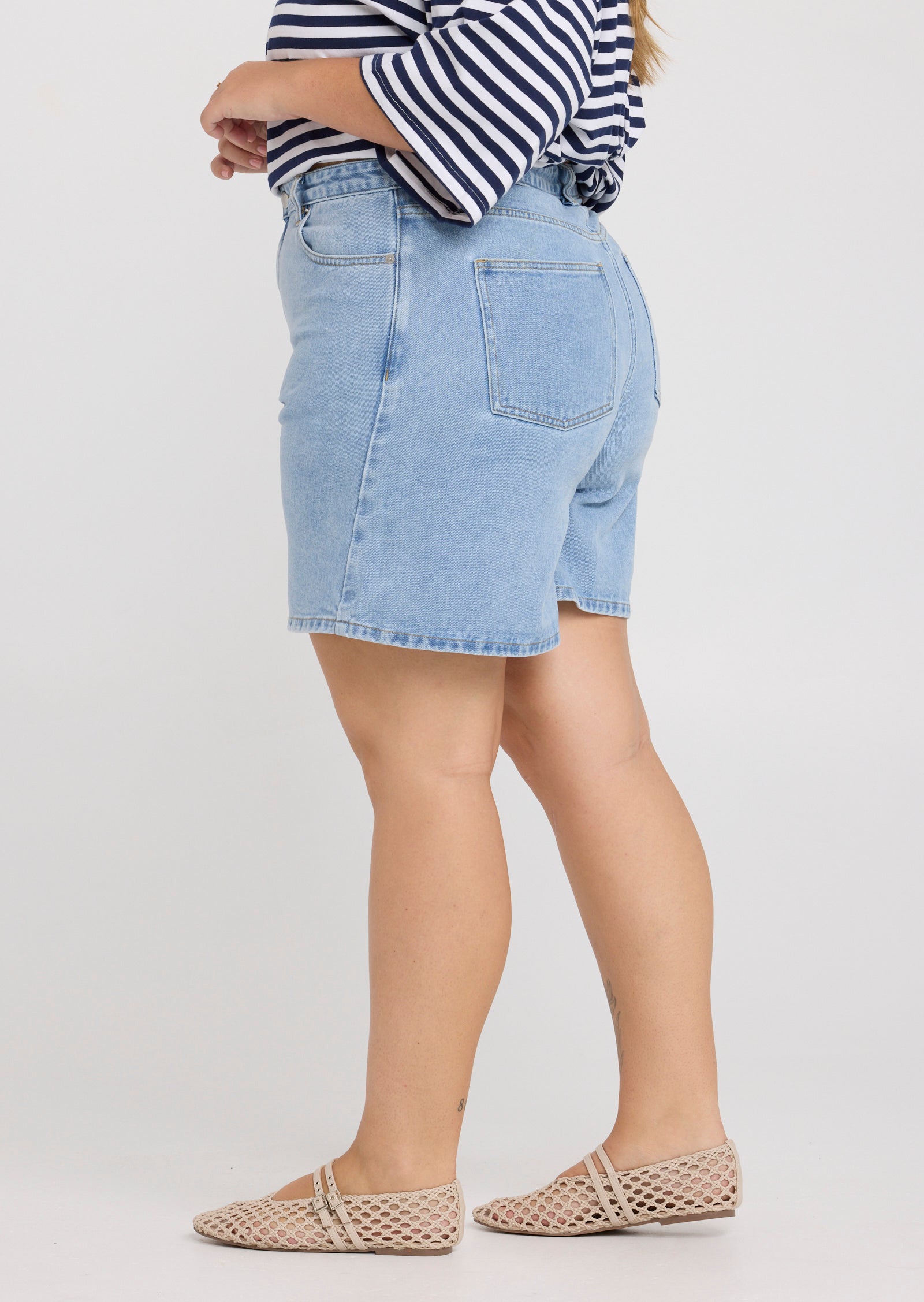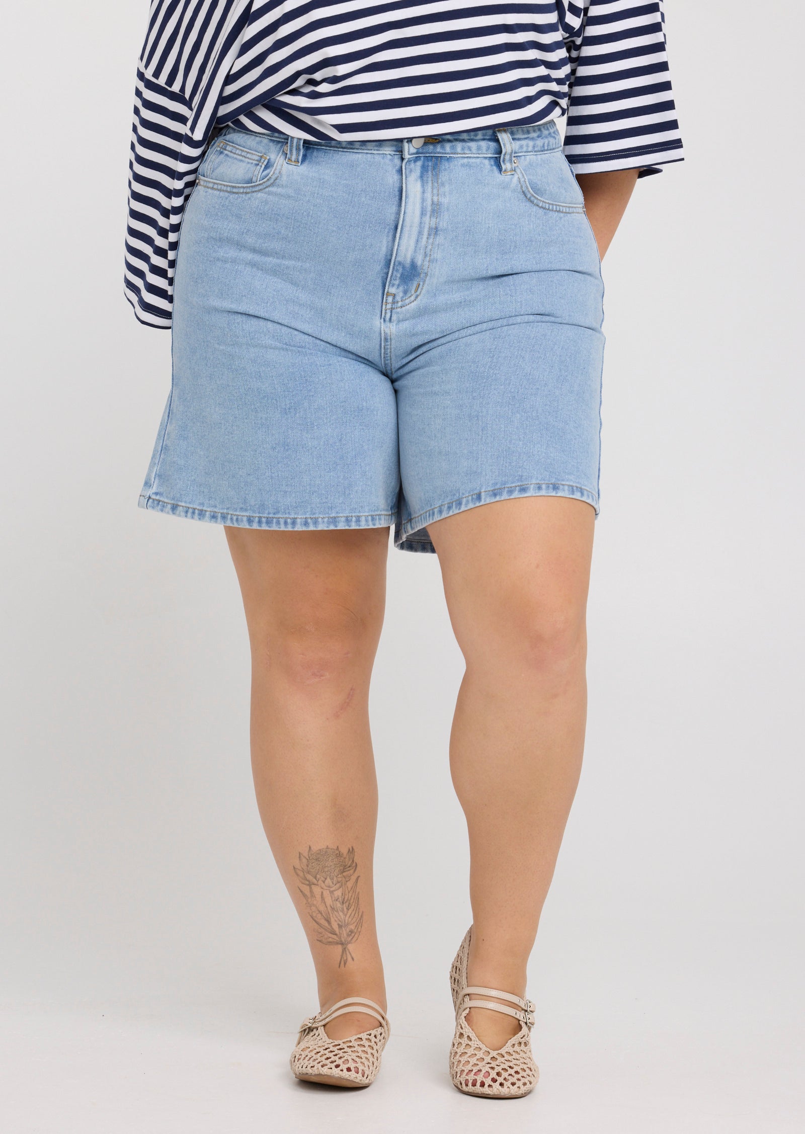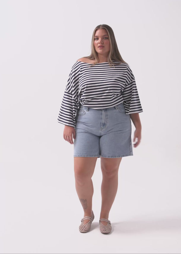The Nell Denim Shorts in Light Wash are a warm-weather essential designed for sizes 14–24. Featuring a fitted high waist and a wide leg silhouette, they offer a modern take on classic denim while maintaining an easy, flattering fit.