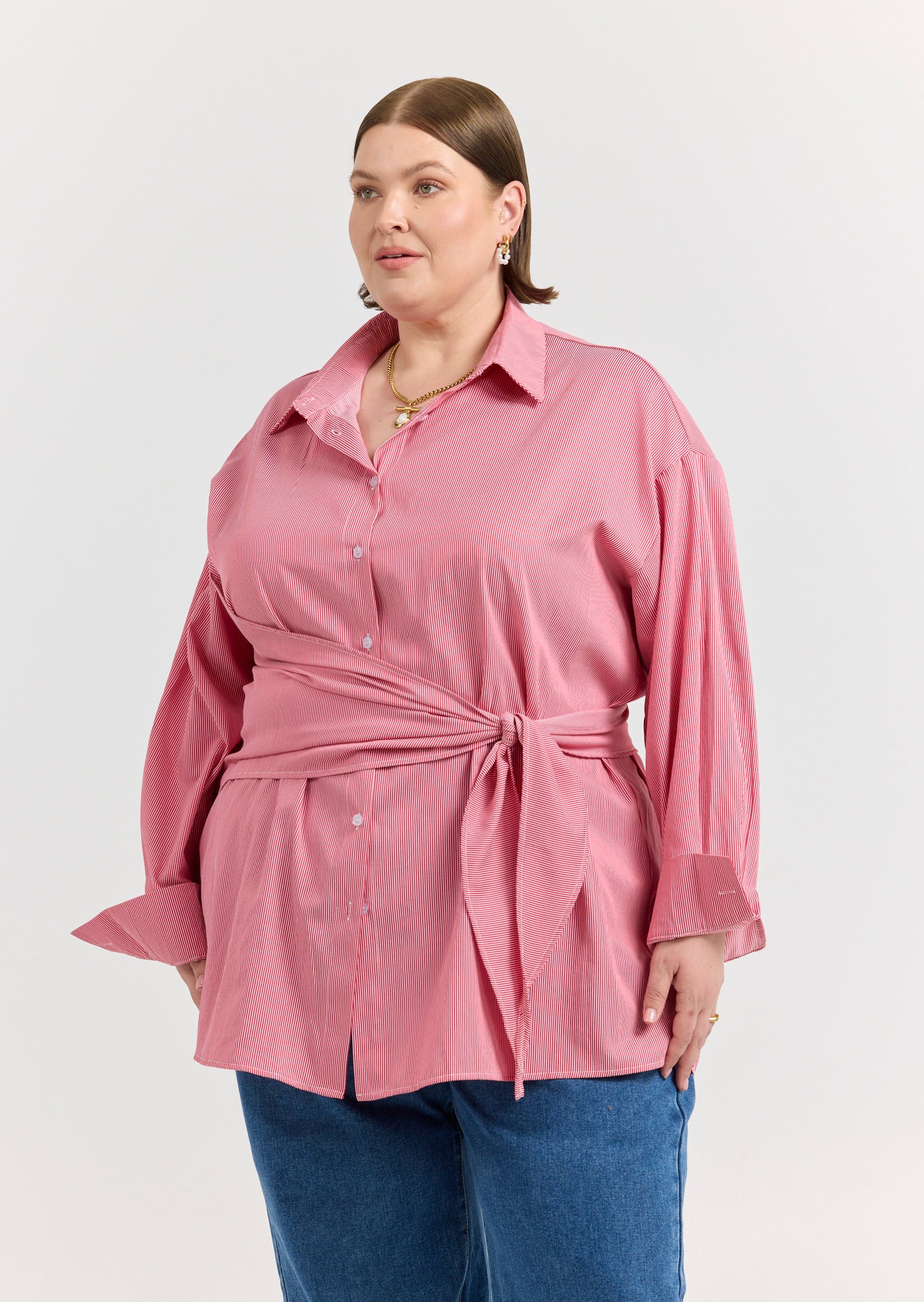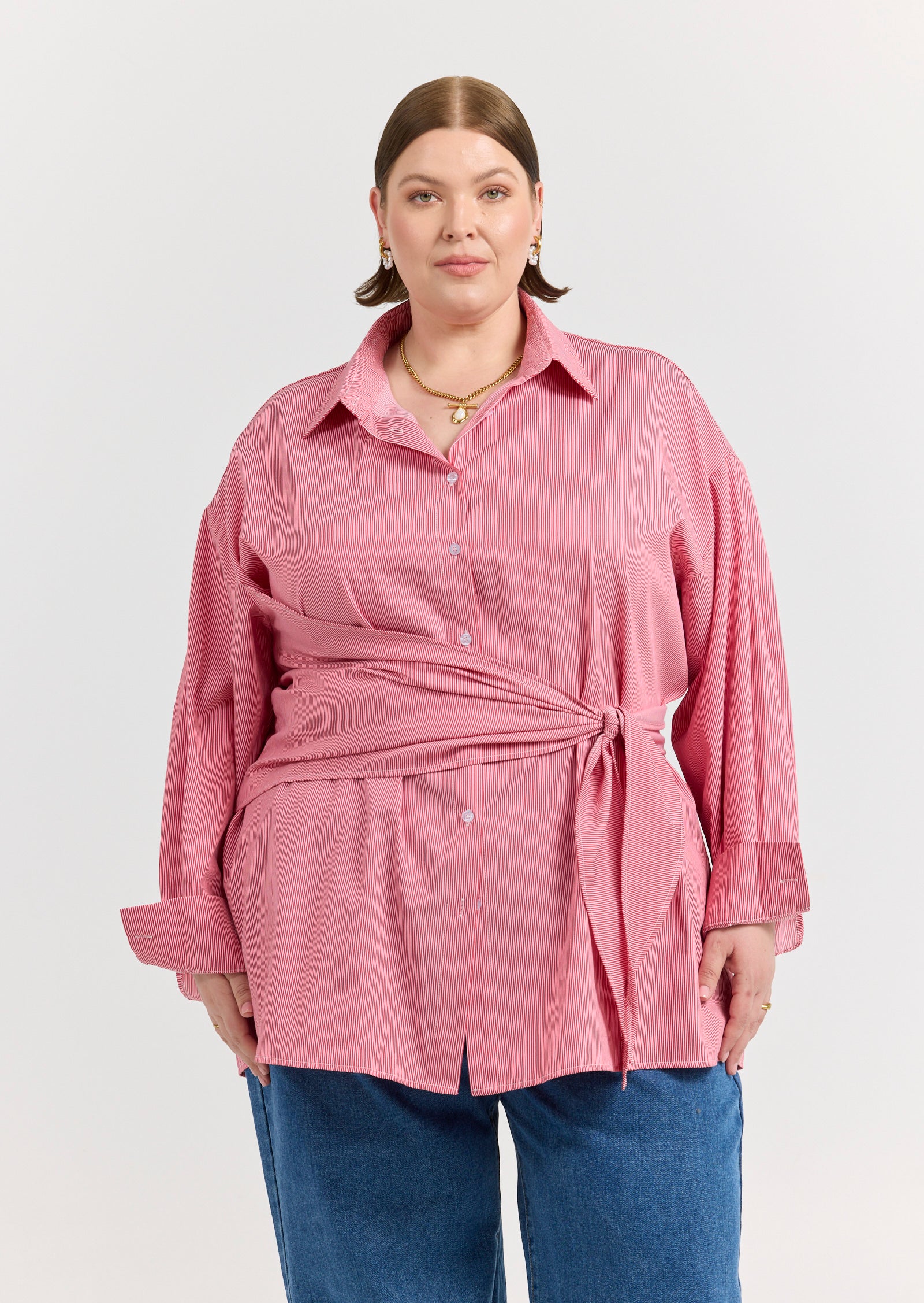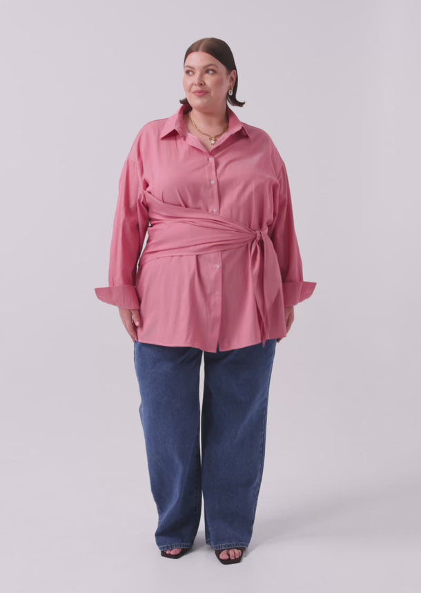 Meet the Reine LS Shirt – a modern reimagining of the classic button-up. Designed with an asymmetrical wrap detail across the waist, it adds a flattering twist to traditional tailoring while maintaining a sharp, structured silhouette.