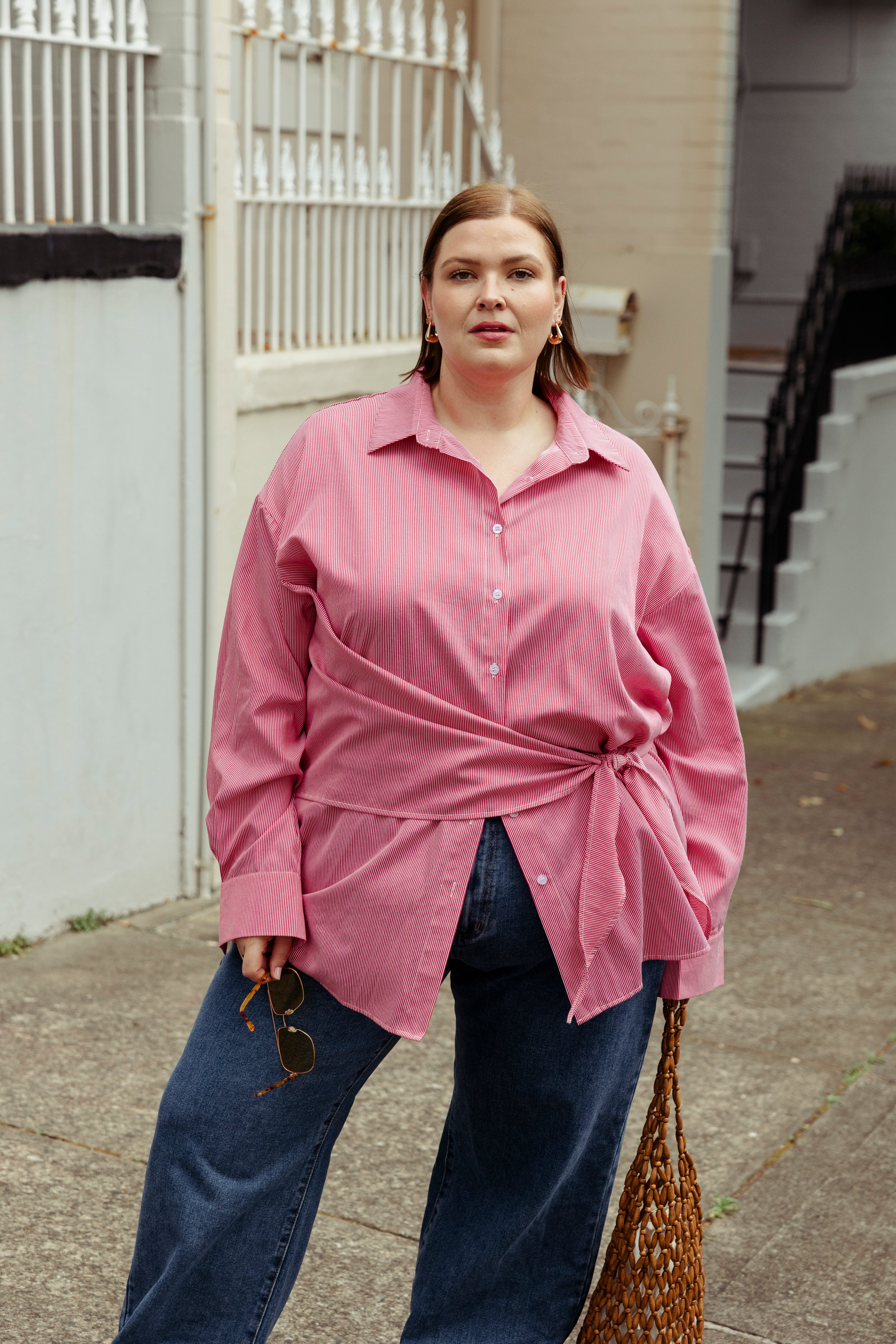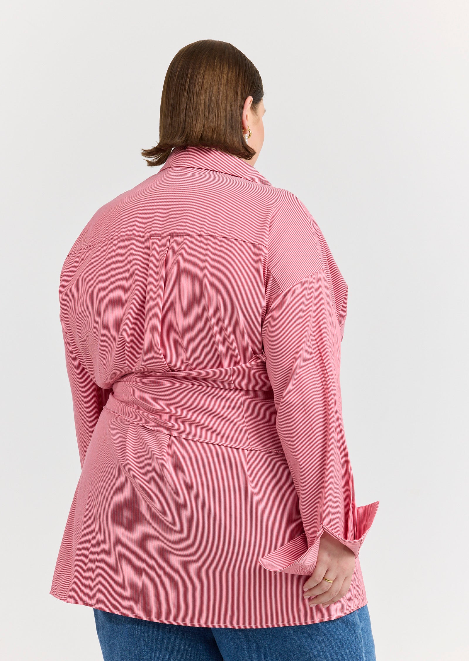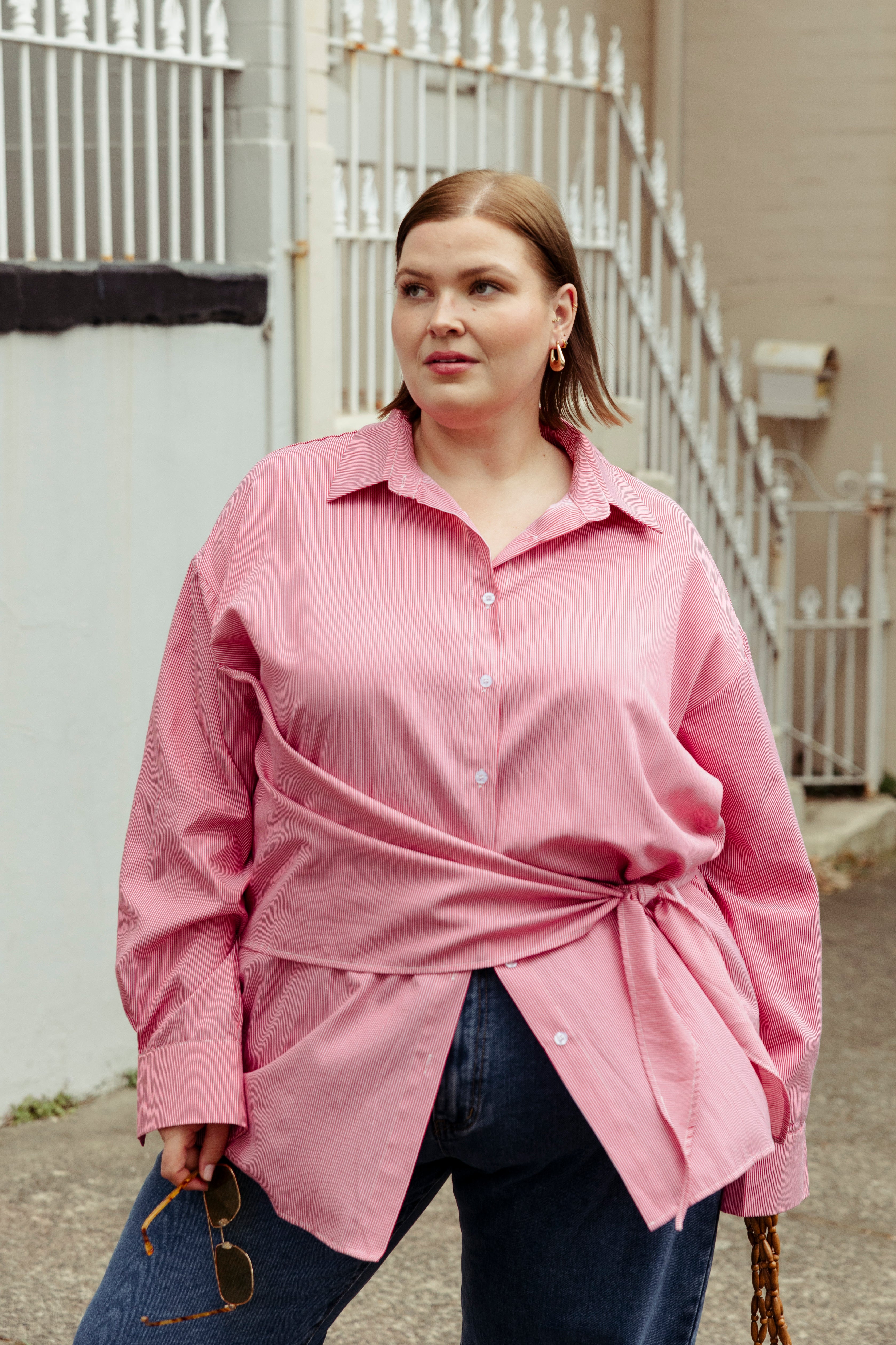 Meet the Reine LS Shirt – a modern reimagining of the classic button-up. Designed with an asymmetrical wrap detail across the waist, it adds a flattering twist to traditional tailoring while maintaining a sharp, structured silhouette.