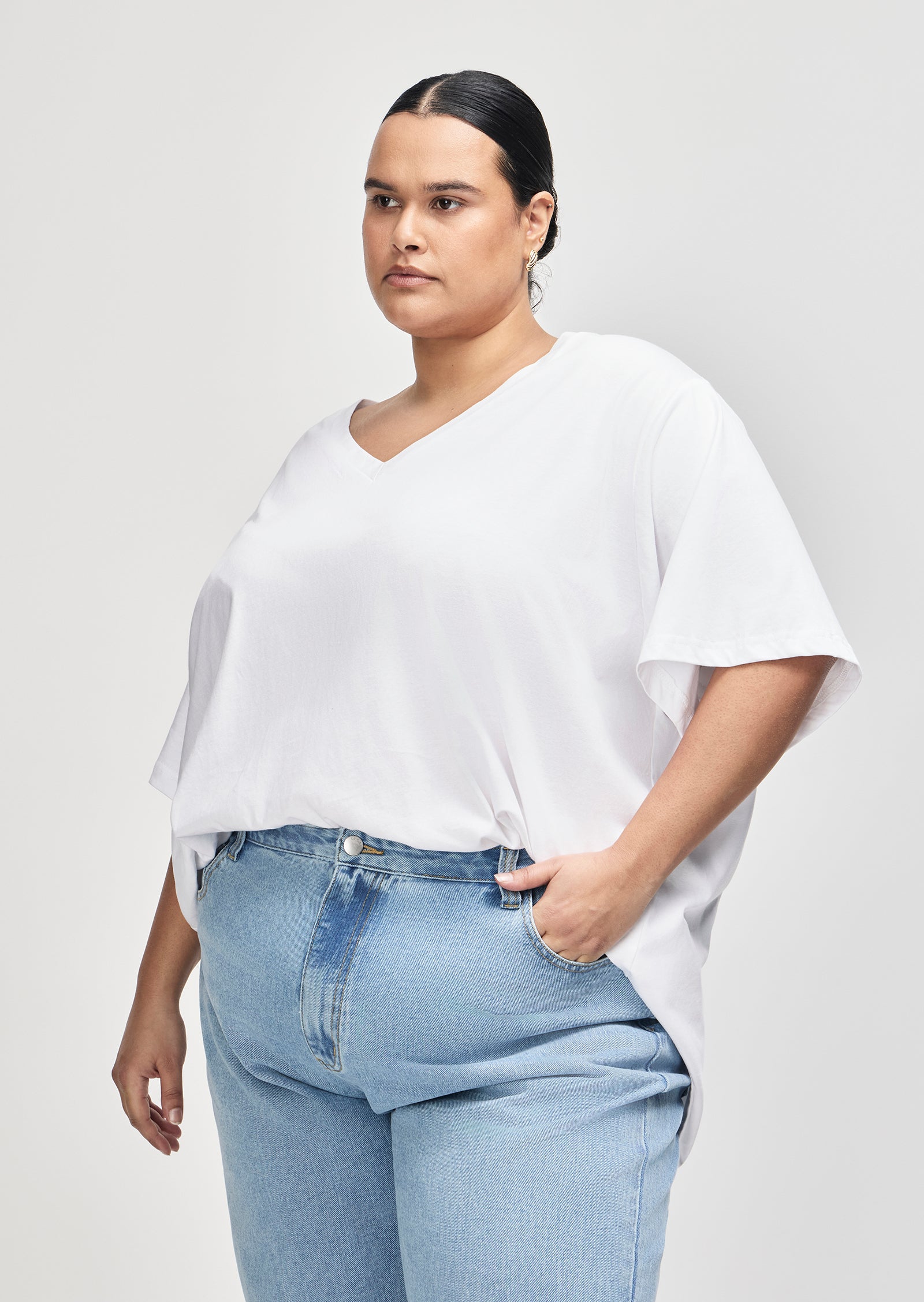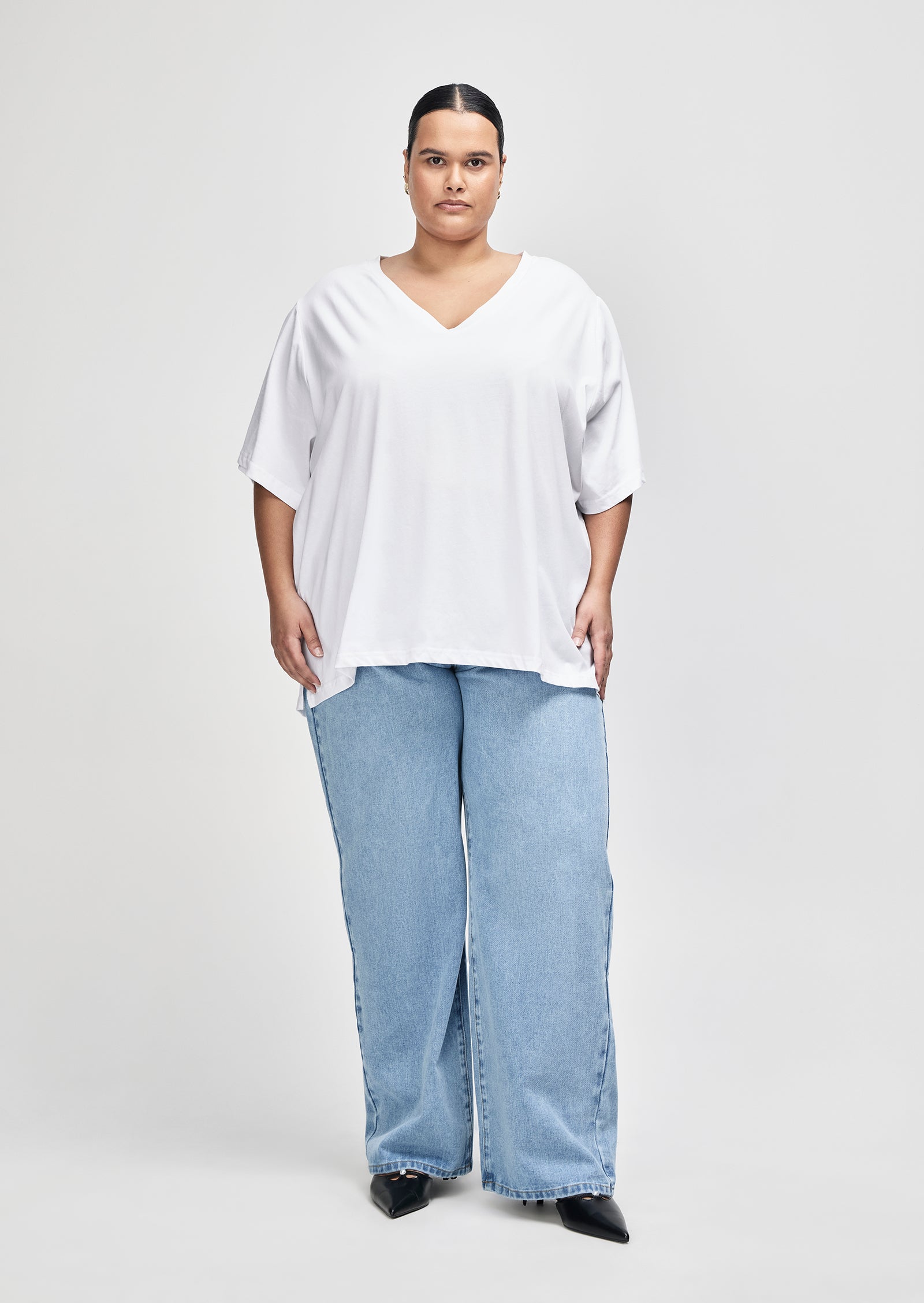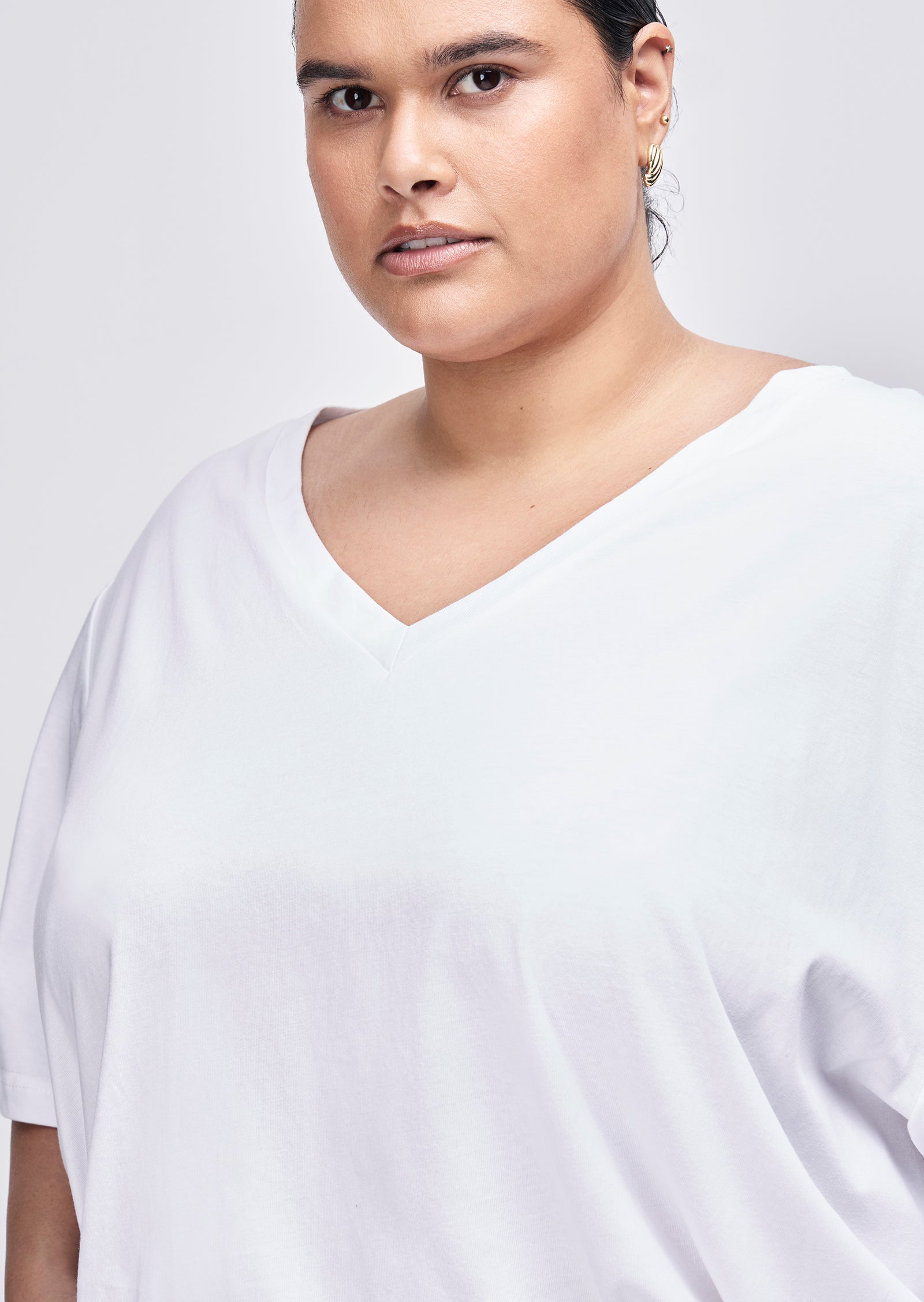 Meet the Sabine V-Neck T-Shirt — a refined essential made for everyday ease. Designed for sizes 14–24, this wardrobe staple features a regular fit and a low V-neckline, offering a clean, flattering silhouette for size-inclusive basics.