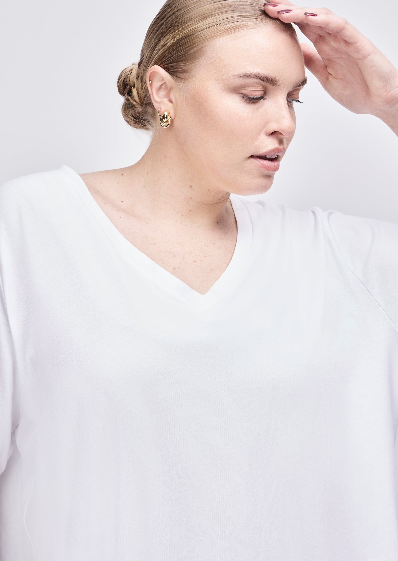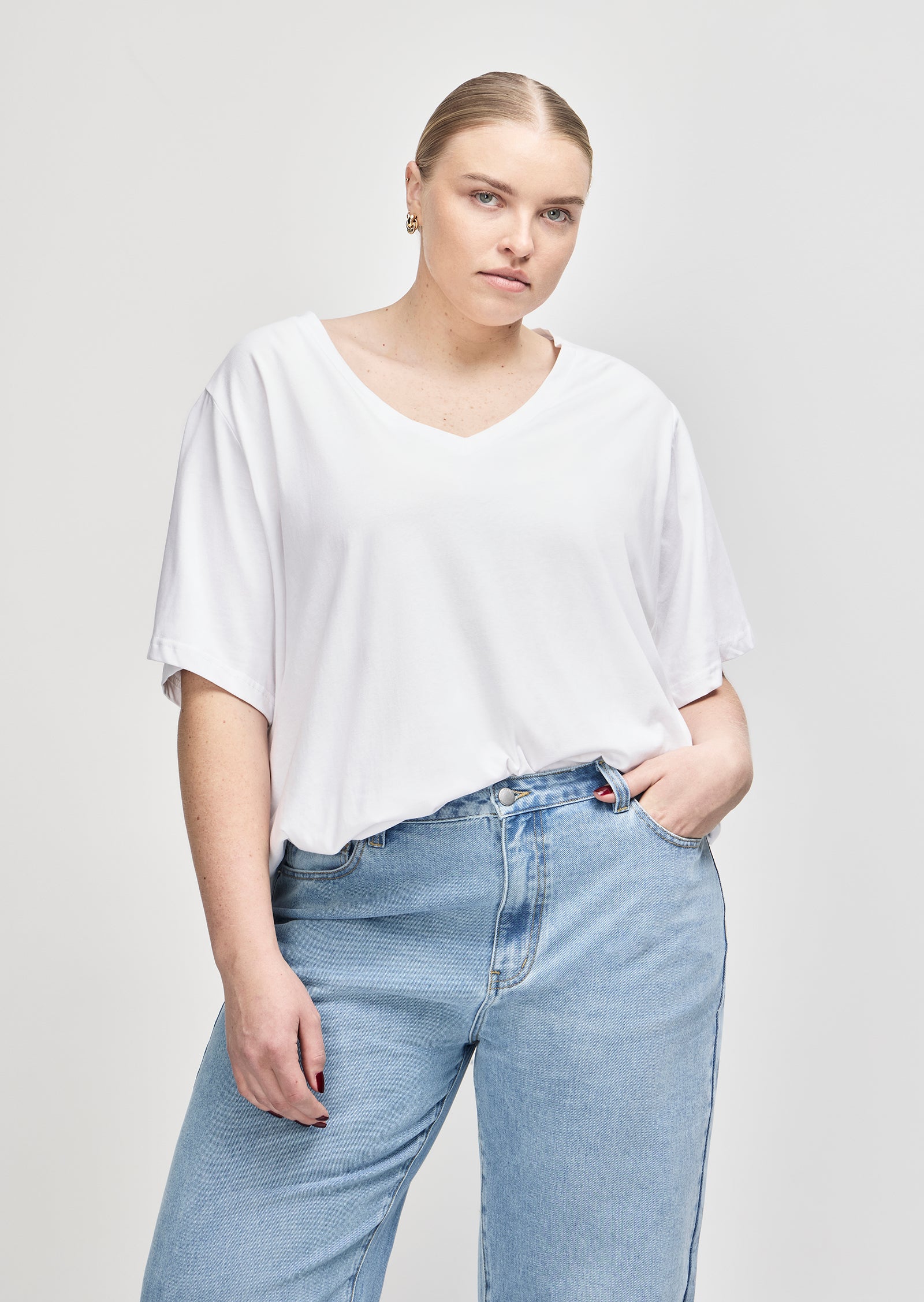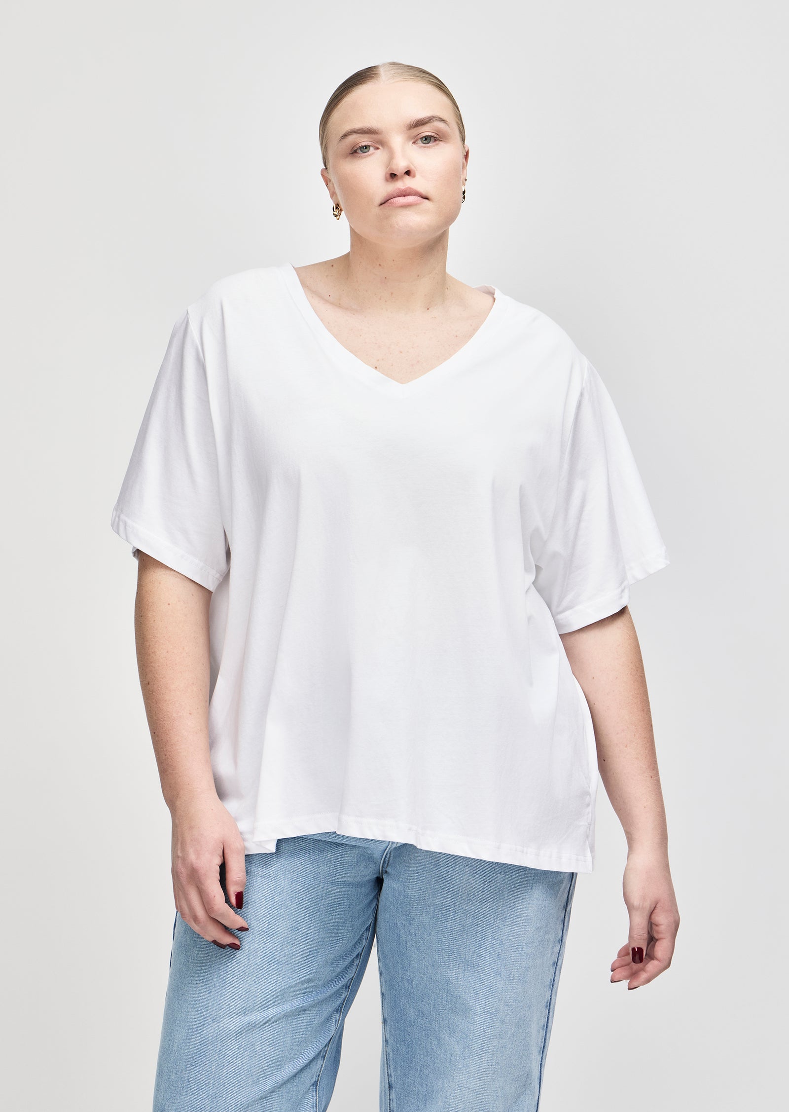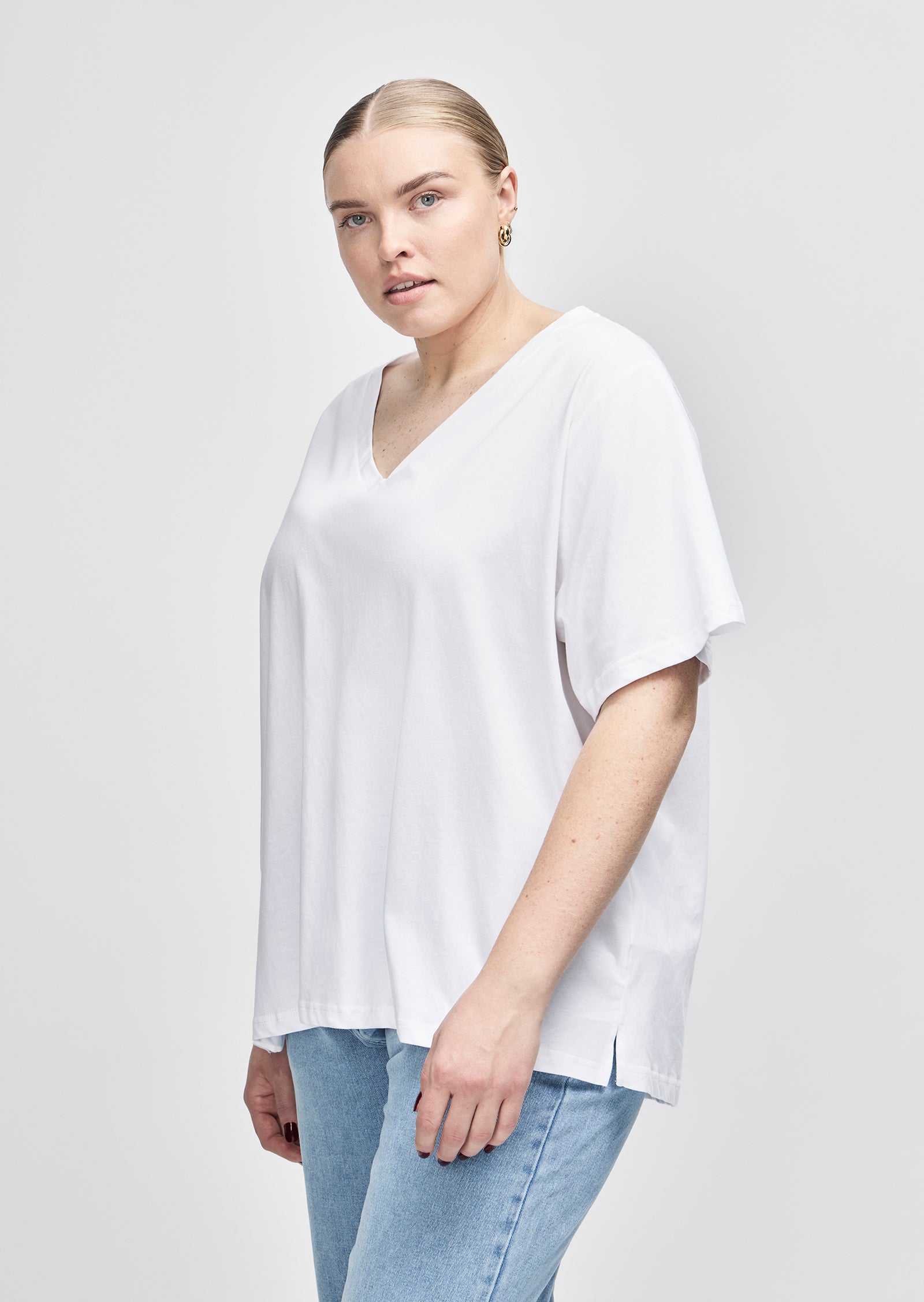 Meet the Sabine V-Neck T-Shirt — a refined essential made for everyday ease. Designed for sizes 14–24, this wardrobe staple features a regular fit and a low V-neckline, offering a clean, flattering silhouette for size-inclusive basics.