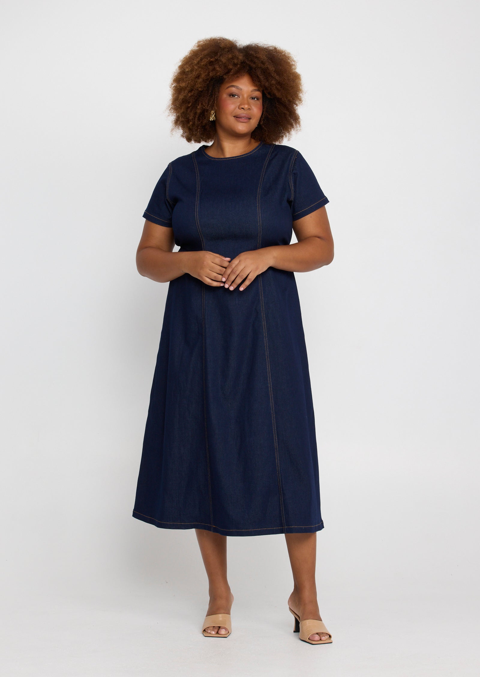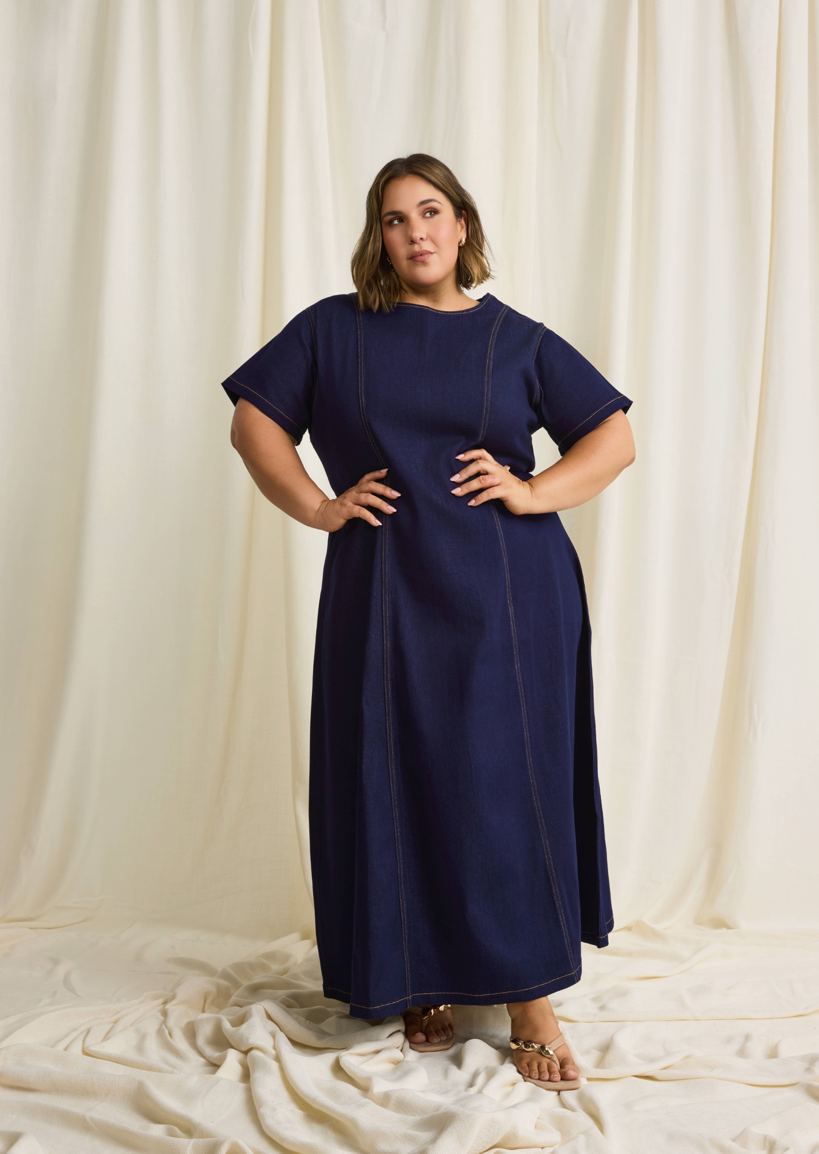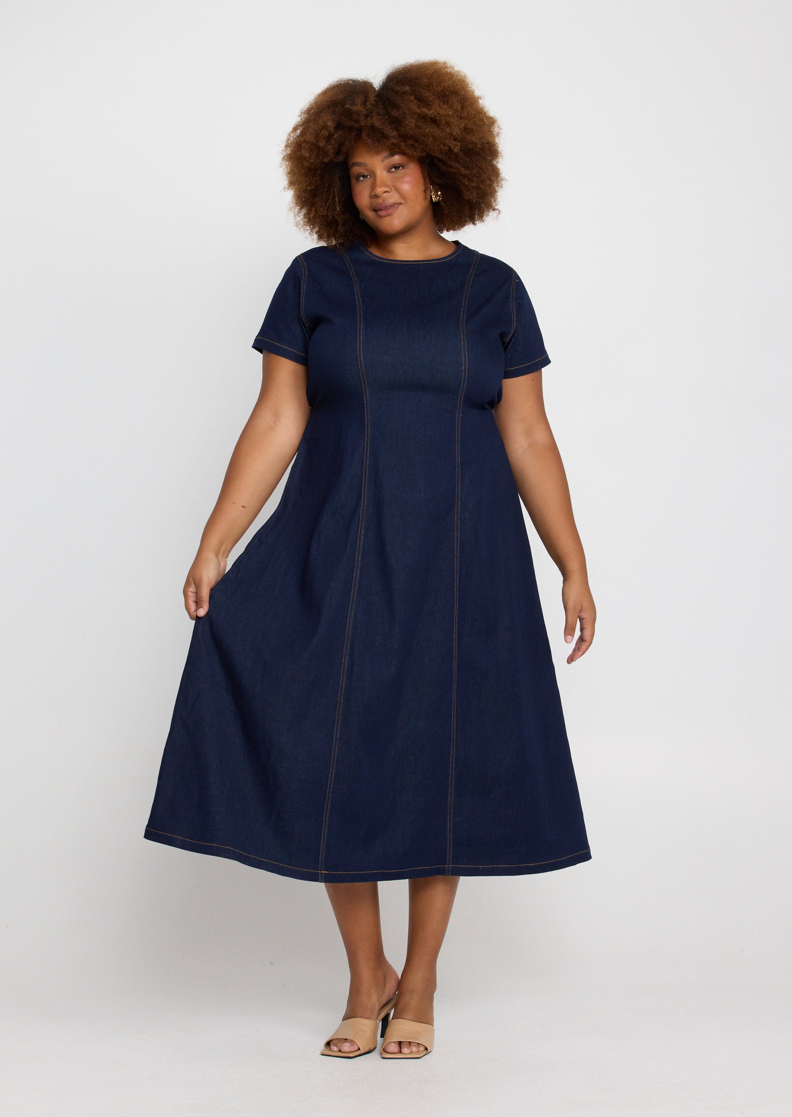 Crafted from thick stretch denim with contrast topstitching, Noa features a clean high neckline and sculpting princess seams that contour through the bodice. The fitted waist enhances shape before falling into a softly flared midi skirt, creating a balanced, hourglass silhouette. An adjustable back tie allows for personalised definition while maintaining comfort and ease of movement.
