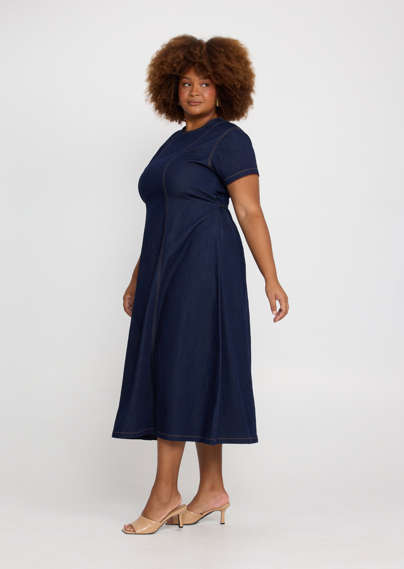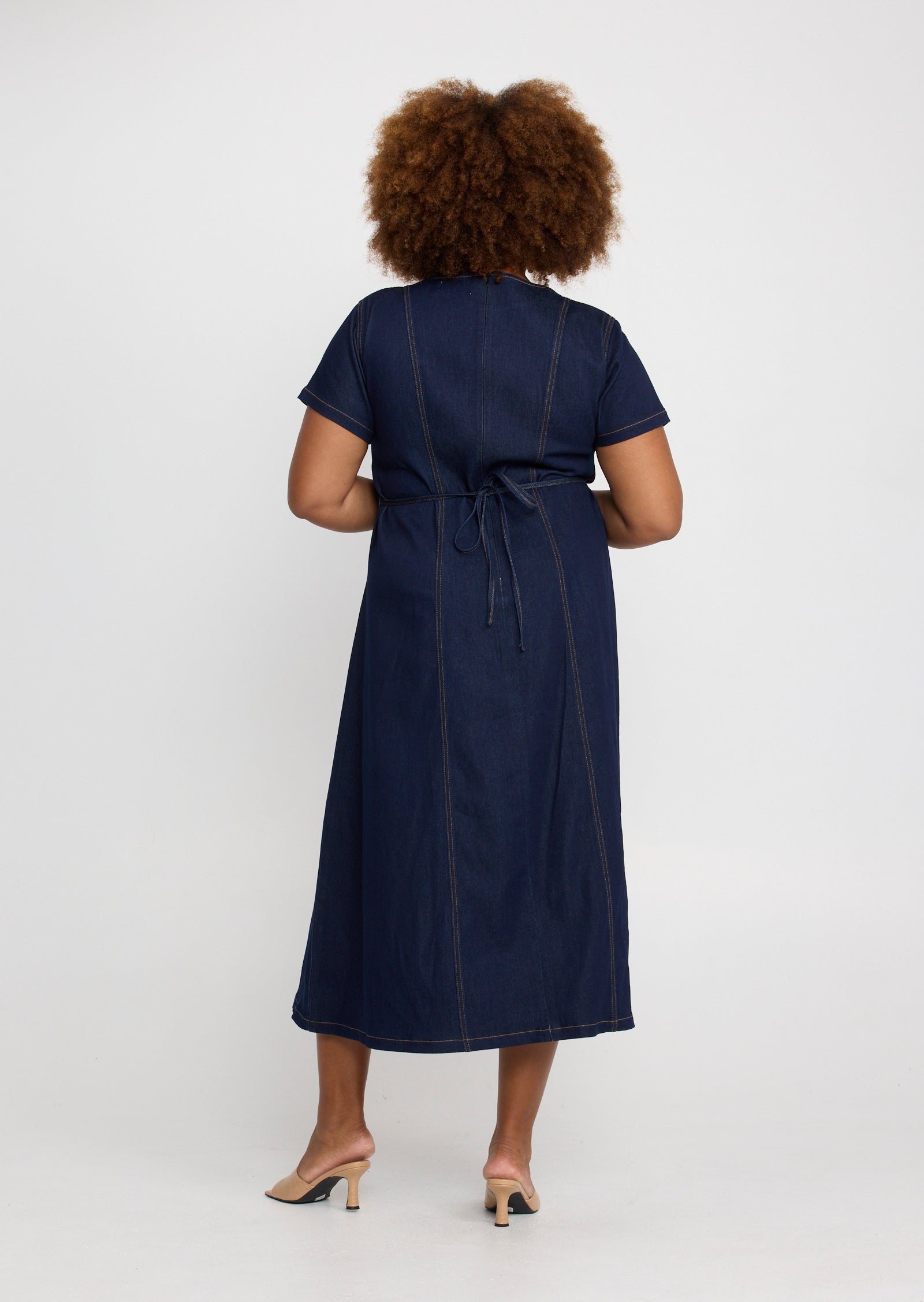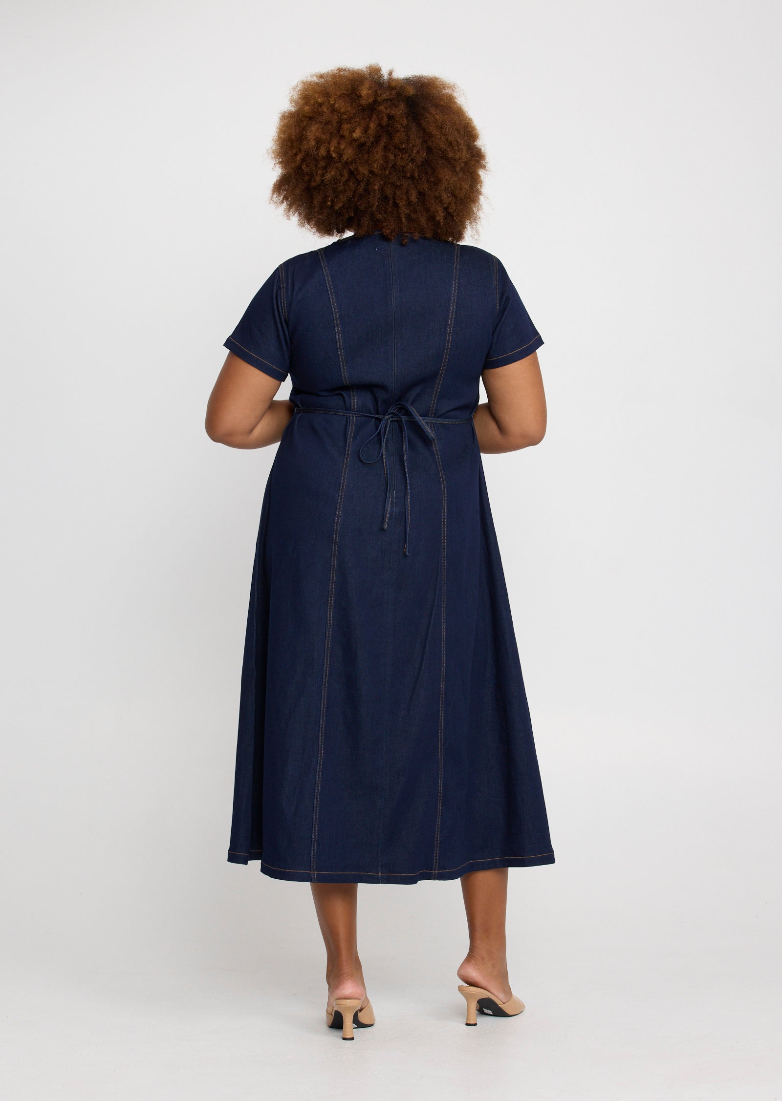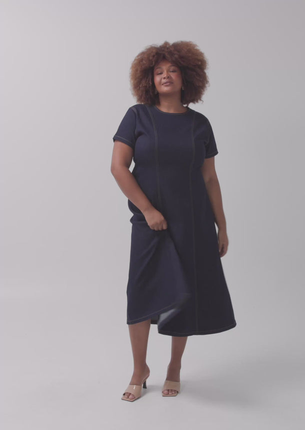 Crafted from thick stretch denim with contrast topstitching, Noa features a clean high neckline and sculpting princess seams that contour through the bodice. The fitted waist enhances shape before falling into a softly flared midi skirt, creating a balanced, hourglass silhouette. An adjustable back tie allows for personalised definition while maintaining comfort and ease of movement.