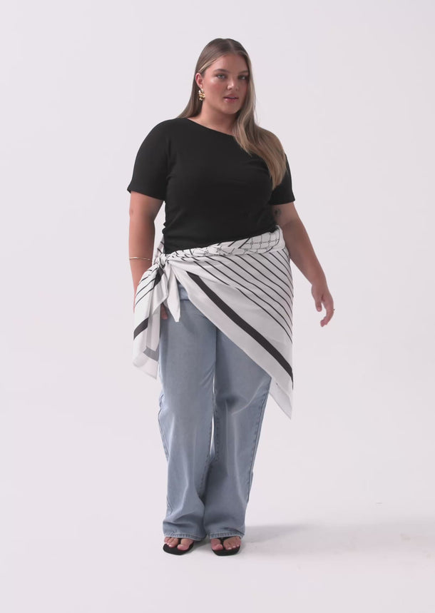The geometric print adds a modern edge, while the generous square shape allows for endless styling options — wear it as a top, tie it around the neck, or drape it over the shoulders for a sophisticated layer.